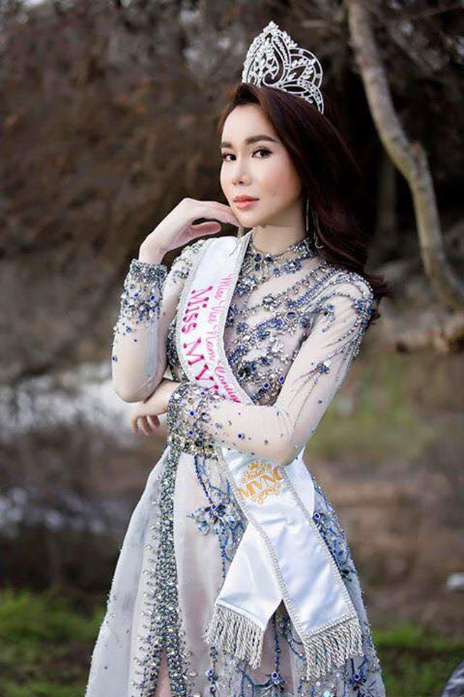 Thời khắc đăng quang, cô diện chiếc áo dài bằng vải trong suốt, đính đá và kim tuyến lóng lánh tinh xảo. Có điều, makeup thì lại tỉ lệ nghịch với trang phục: thô cứng và già dã man.