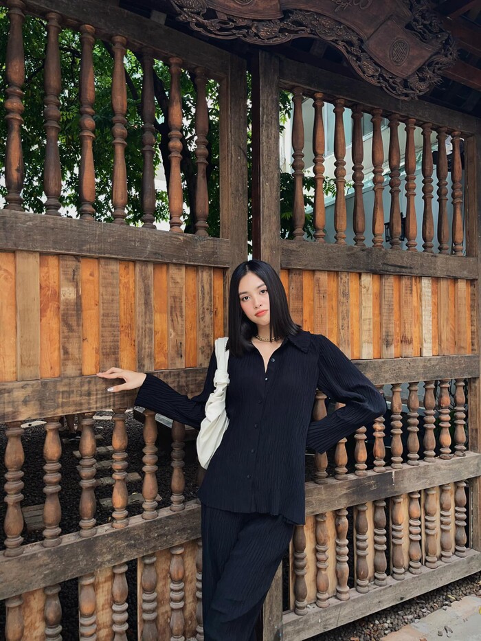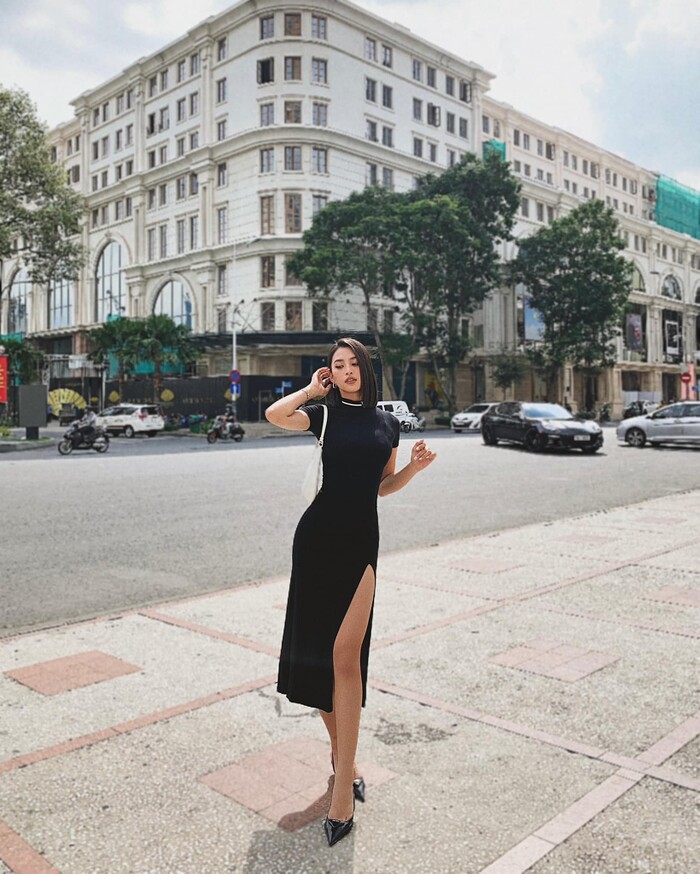 Dạo gần đây, Tiểu Vy rất chuộng các trang phục đen khi ra phố hay đi sự kiện. Màu đen có vẻ được lòng nàng Hậu trong thời gian này.