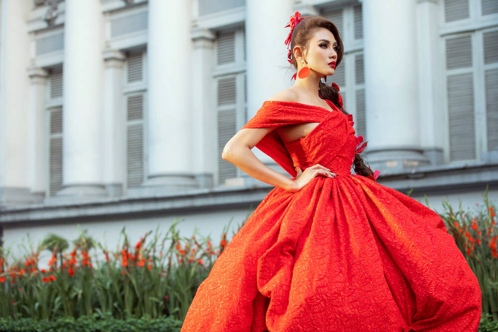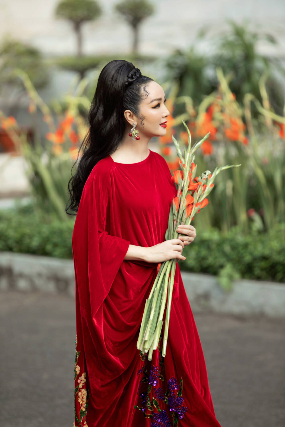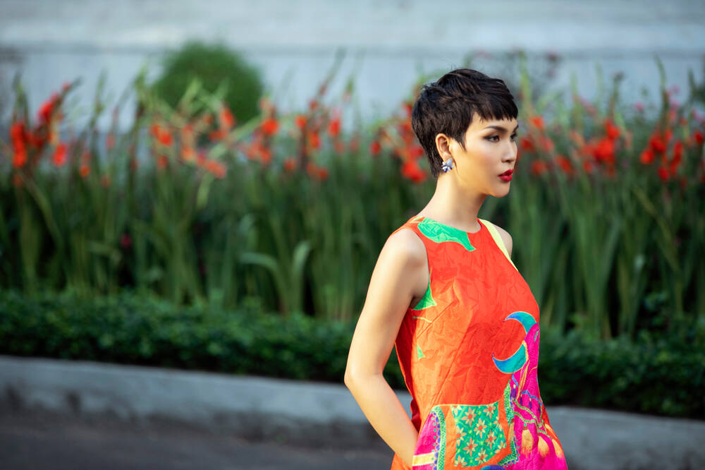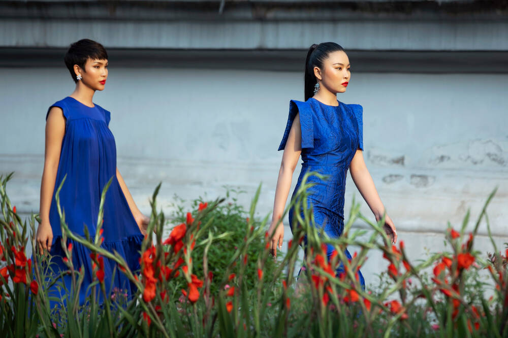 Hoa lay ơn được khai thác trên các thiết kế bay bổng, váy maxi mùa hè, váy organza, váy midi kết hợp áo vest lửng. Các màu sắc hoa lay ơn từ cam, đỏ, xanh, tím hoà vào nhau như một bức tranh xuân rực rỡ.