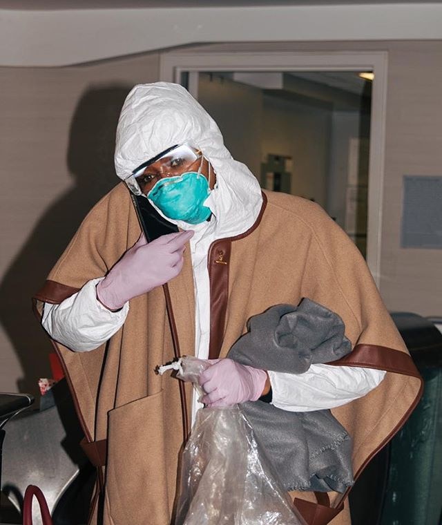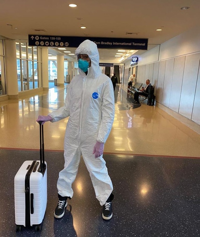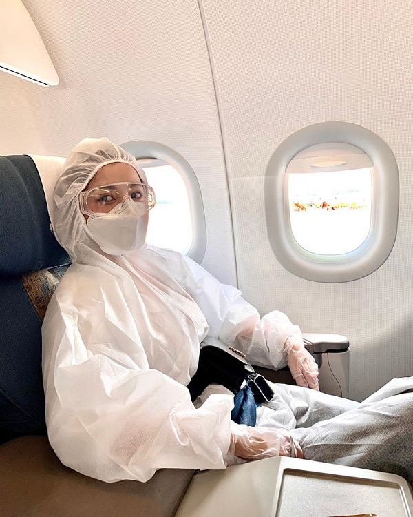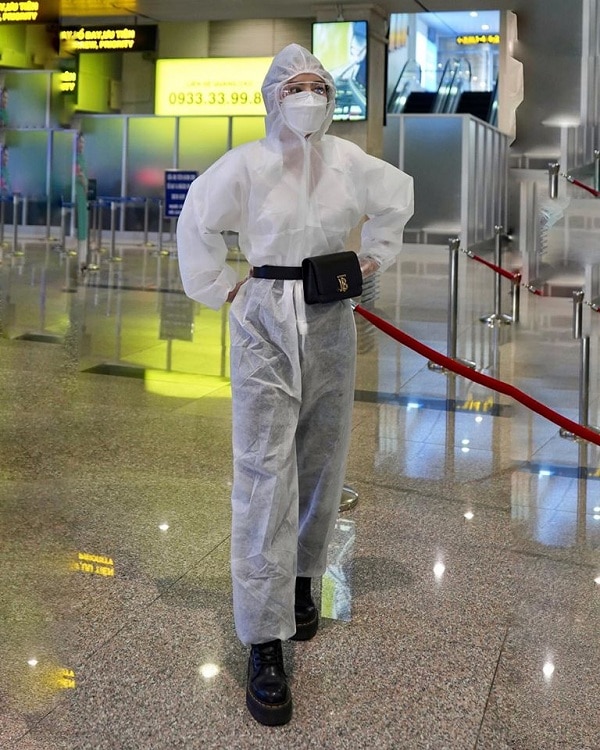 Buộc phải di chuyển giữa lúc dịch Covid-19 đang diễn biến phức tạp, Chi Pu cũng học hỏi 'Báo đen' Naomi Campbell , mặc trang phục bảo hộ kín mít khi đi máy bay.