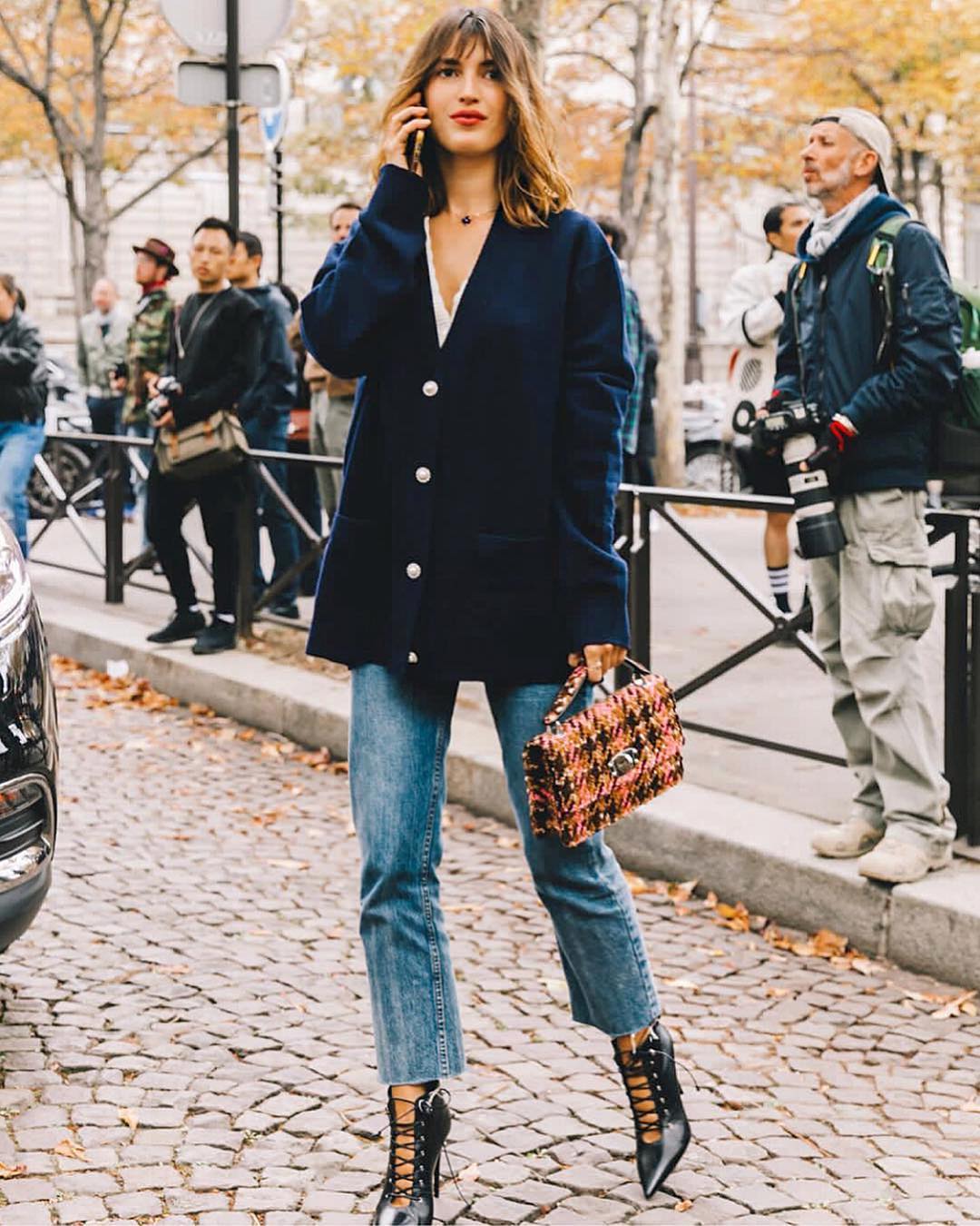 Cardigan là một món thời trang quan trọng trong tủ đồ của gái Pháp. Một trong những cách diện áo cardigan yêu thích của họ chính là mặc như một chiếc áo bình thường, thay vì khoác ngoài những items khác. Kiểu áo cardigan dáng lửng là một trong những items siêu phổ biến, và món đồ này không chỉ để diện trong mùa đông mà còn có thể trưng dụng vào cả mùa thu nữa.