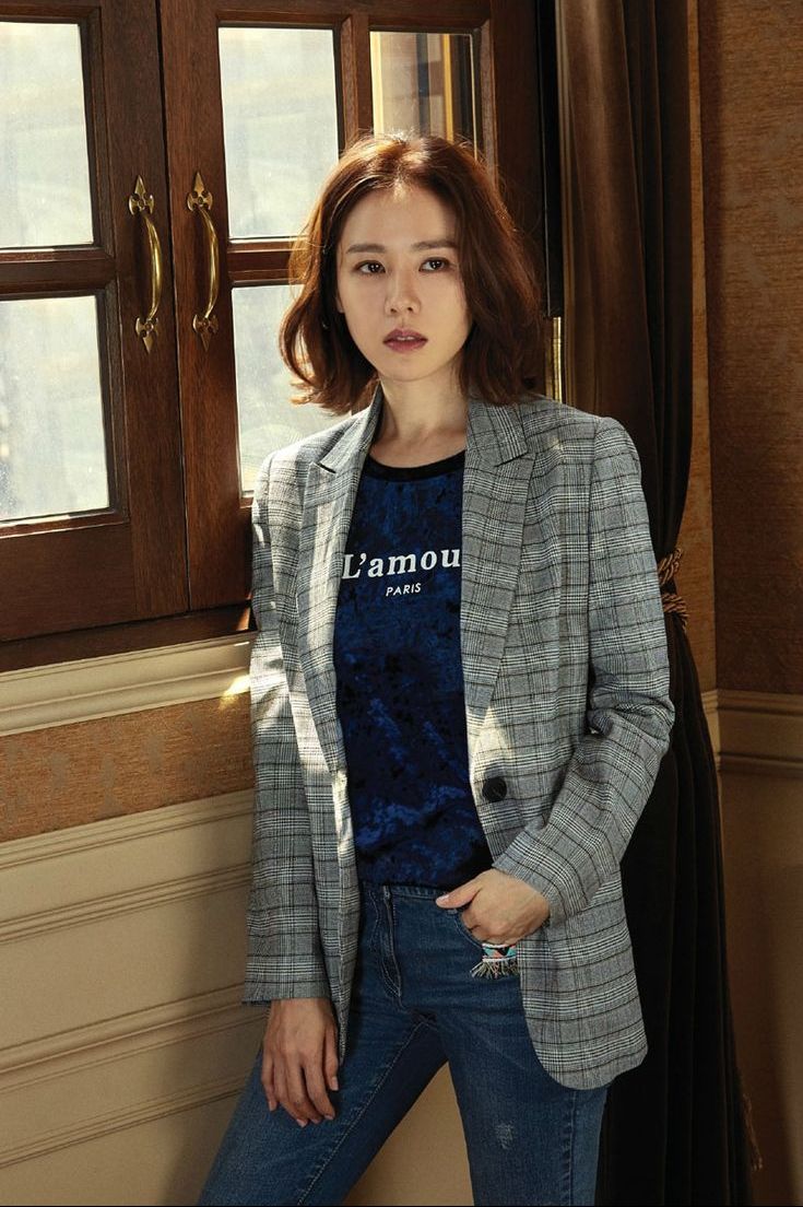 Son Ye Jin cũng thích mặc áo phông kết hợp với blazer cổ điển để "làm mềm" vẻ ngoài cứng nhắc của một chiếc áo blazer đứng dáng. Blazer + áo phông + quần jeans luôn là công thức đơn giản nhưng thanh lịch tuyệt đối cho phụ nữ tuổi ngoài 30 ghi điểm trong mắt người đối diện.