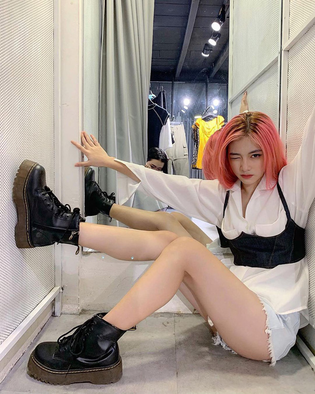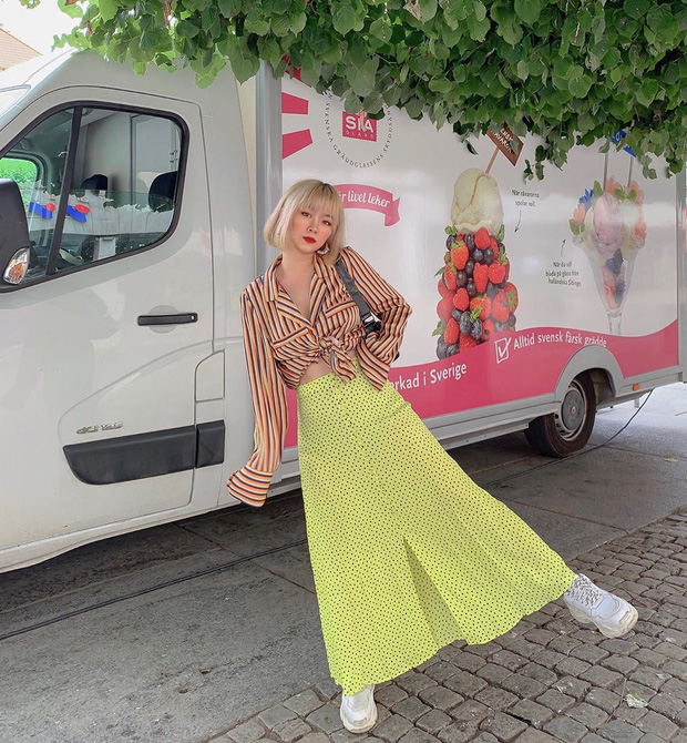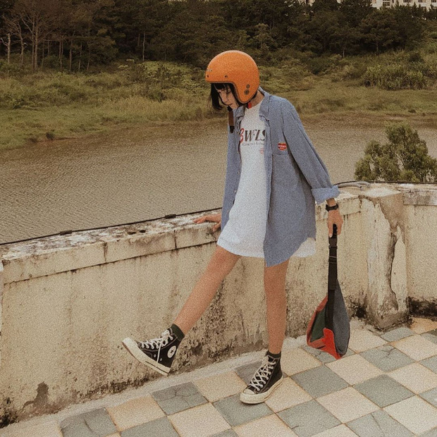 Mai Kỳ Hân @maikyhan dễ thương hết sức với set áo sơ mi - áo phông oversize mix cùng sneaker cao cổ. Chiếc mũ bảo hiểm màu cam bỗng trở thành món phụ kiện hay ho nổi bật nhất set đồ.