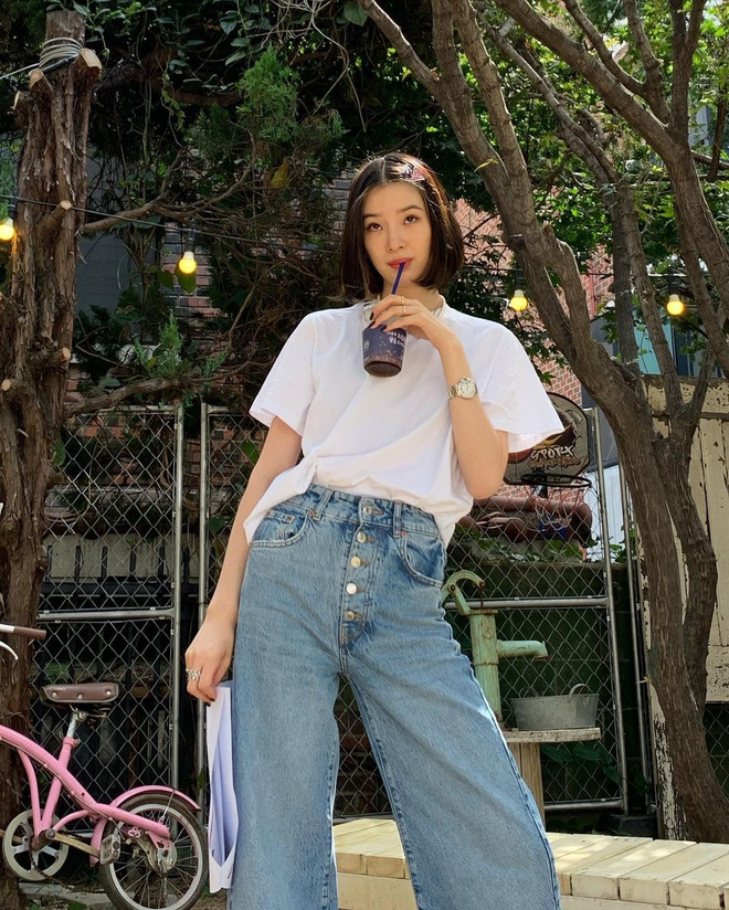 Có thể thấy, Irene Kim cực mê quần jeans khi item này xuất hiện với đủ màu sắc, kiểu dáng trong những bức hình của cô. Đây quả thực là "bảo bối" không riêng của Irene Kim mà còn của mọi cô gái khi bạn có thể mix mọi kiểu áo với em nó. Áo phông oversized hay croptop thường xuyên được Irene Kim ưu ái. Tip nhỏ để công thức mix đồ này bớt nhàm chán đó là siêng sưu tầm nhiều kiểu dáng khác nhau như cổ vuông, bèo nhún ở chân áo và chọn màu sắc sáng như xanh lá, hồng, trắng chẳng hạn.