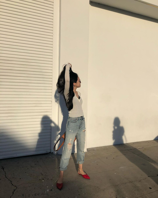 Khi mặc jeans, cô nàng cũng phối đồ rất ngẫu hứng và cực đơn giản. Một outfit đơn giản với jeans rách xắn gấu, áo hai dây cùng đôi mule bệt đỏ là đủ tung tăng ra đường. Còn không thì mix jeans với một chiếc áo thun đen, cổ chữ V không thể giản dị hơn. Nhìn chung, nếu một ngày nào đó bạn hơi ngấy với nào là quần là áo lụa bóng bẩy trên sàn diễn thì Instagram của Naeun là một lựa chọn siêu phù hợp.
