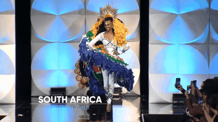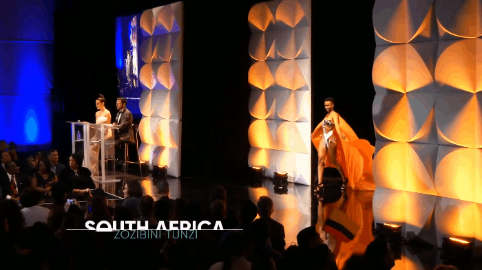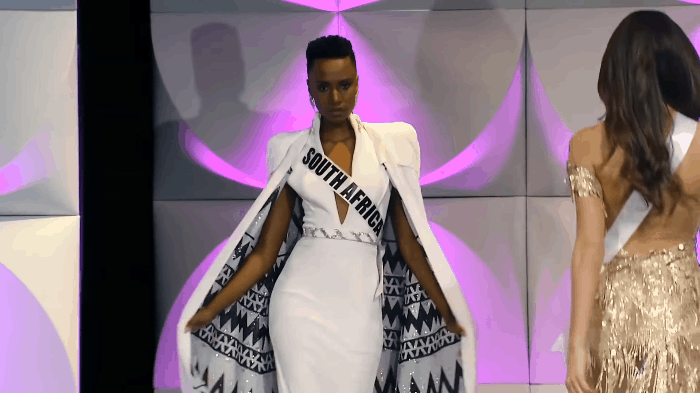 | Zozibini Tunzi trình diễn bikini cùng Top 10 trong đêm chung kết Miss Universe 2019. |