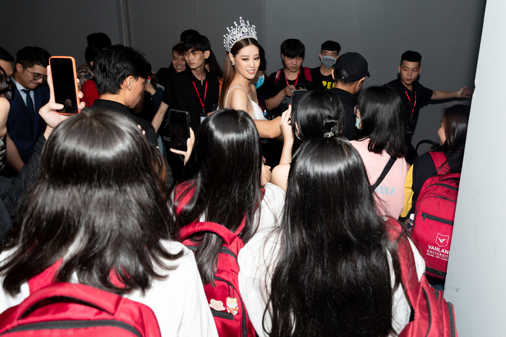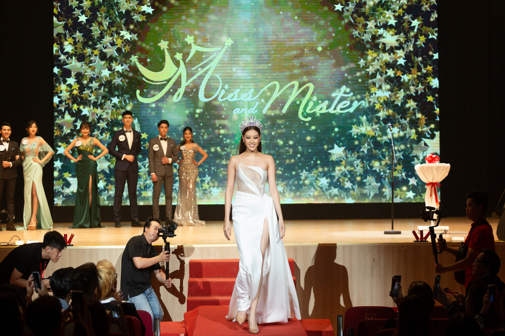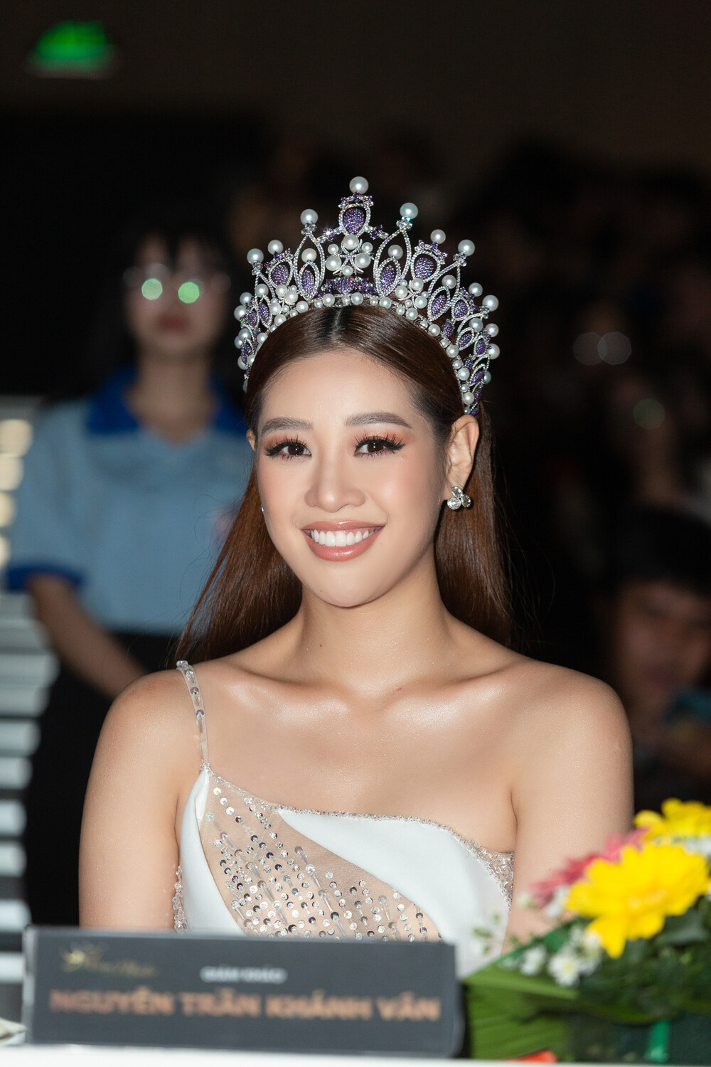 Trước lúc công bố kết quả cuộc thi và thay mặt lên trao vương miện cho tân hoa khôi, hoa hậu Khánh Vân được mời lên sân khấu trình diễn. Đương kim Hoa hậu Hoàn vũ Việt Nam sải những bước đi vô cùng tự tin và thần thái khiến các bạn sinh viên thích thú.