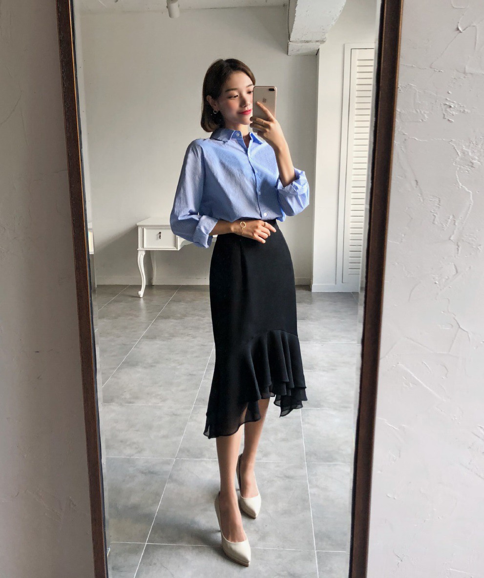 Sự kết hợp giữa chân váy và giày cao gót sẽ cho bạn vẻ ngoài 100% nữ tính và tất nhiên, chiều cao sẽ được "hack" triệt để theo đúng sứ mệnh của những đôi giày cao gót. Áp dụng công thức này nơi công sở, bạn sẽ có được set đồ thanh lịch, chuyên nghiệp hết sức, nhất là khi mix cùng áo sơ mi, blouse rồi sơ vin gọn gàng.