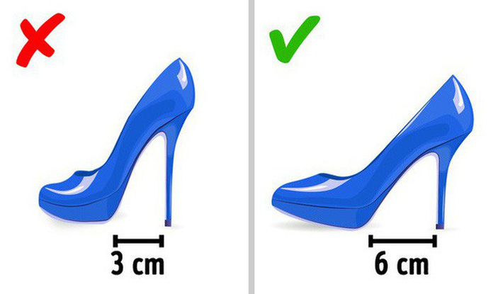 Khi xỏ chân thử một đôi cao gót, hãy thử nhiều độ cao, đôi giày nào có phần đế tiếp xúc hết với gam bàn chân (gam bàn chân vừa khít với giày) thì có nghĩa là chiều cao đó phù hợp với chân của bạn. Nếu gam bàn chân vẫn bị cong lên tức là cả chiều cao lẫn phần mũi chân chưa thực sự thoải mái, hãy chọn một đôi cao gót khác phù hợp hơn.