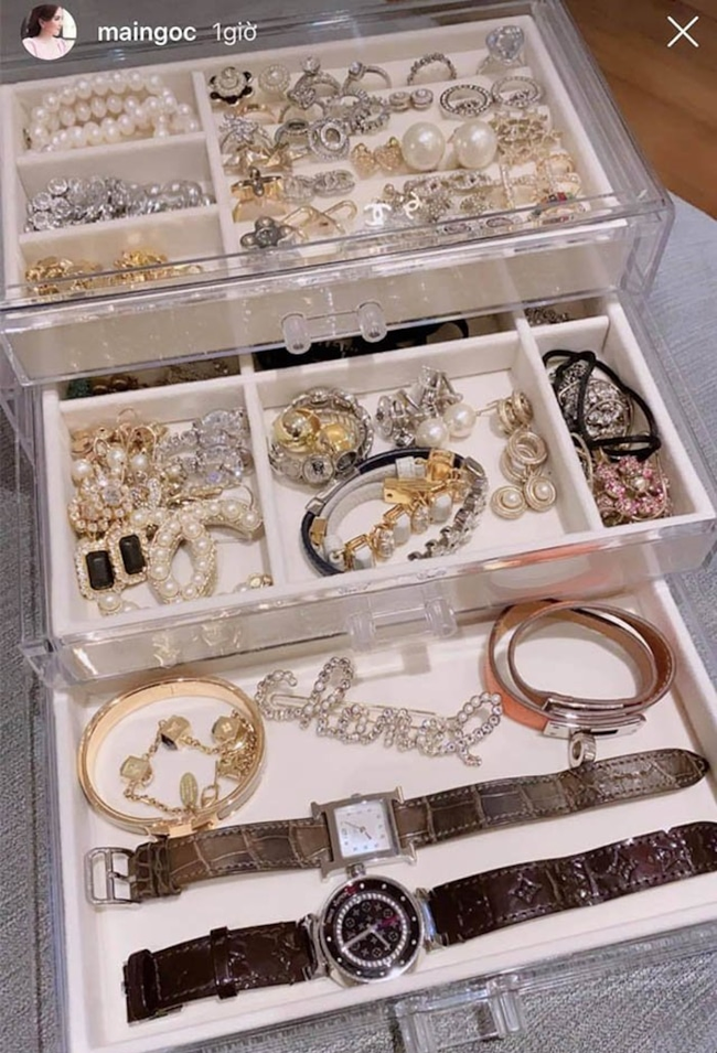 Ngắm sơ sơ chiếc hộp đựng trang sức 3 tầng nhỏ xinh tinh tế của Mai Ngọc, ai cũng trầm trồ khi nghĩ đến giá tiền của từng món. Toàn phụ kiện của những thương hiệu đình đám như Chanel, Dior, LV, Hermes... với mức giá ít nhất từ vài triệu cho đến hàng chục triệu đồng, riêng chiếc kẹp tóc ngọc trai Chanel đã có giá hơn 20 triệu, còn chiếc đồng hồ nạm kim cương của LV cũng xấp xỉ cả trăm triệu đồng.
