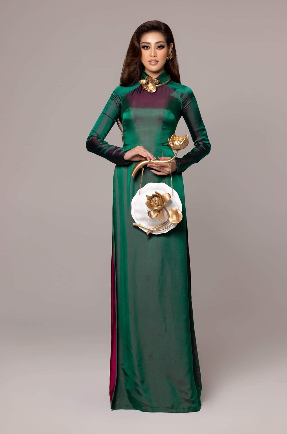 Trong buổi ăn tối ngày 12/5, Khánh Vân lần đầu xuất hiện với tà áo dài tại Miss Universe 2020. Điểm nhấn trên bộ cánh mang đậm dấu ấn truyền thông là chiếc vòng cổ và phụ kiện hình hoa sen, giúp cho tổng thể của Khánh Vân thêm phần sang trọng.