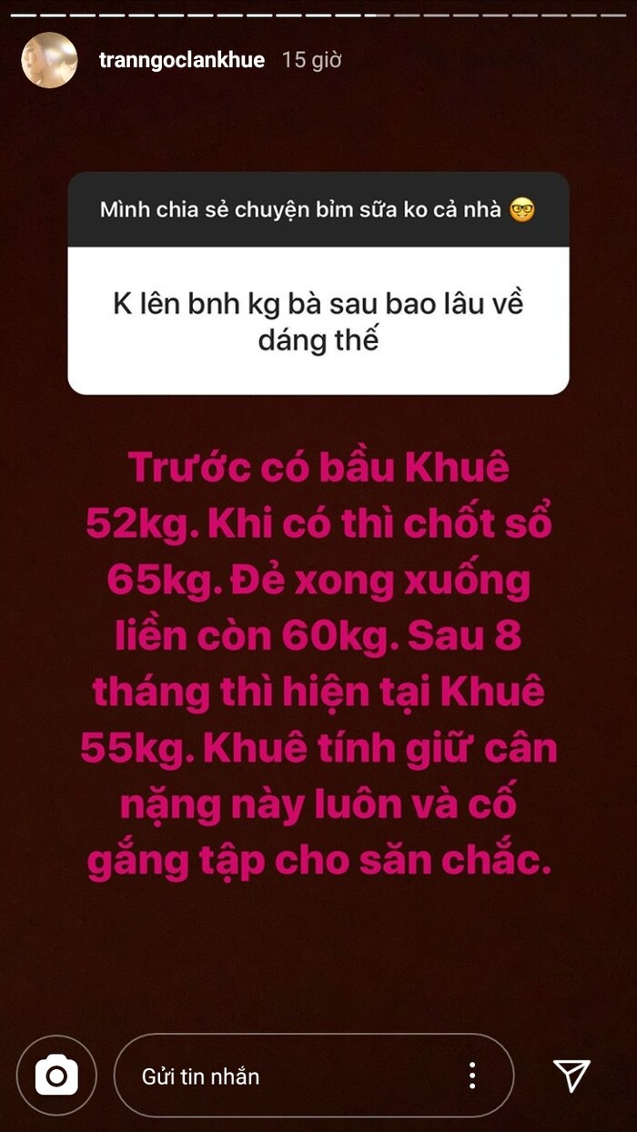 Lan Khuê khoe khi có bầu có 52kg và hiện tại sau 8 tháng sinh con cân nặng của cô đang là 55kg. Lan Khuê dự tính duy trì số cân nặng này và sẽ tập luyện để cơ thể săn chắc.