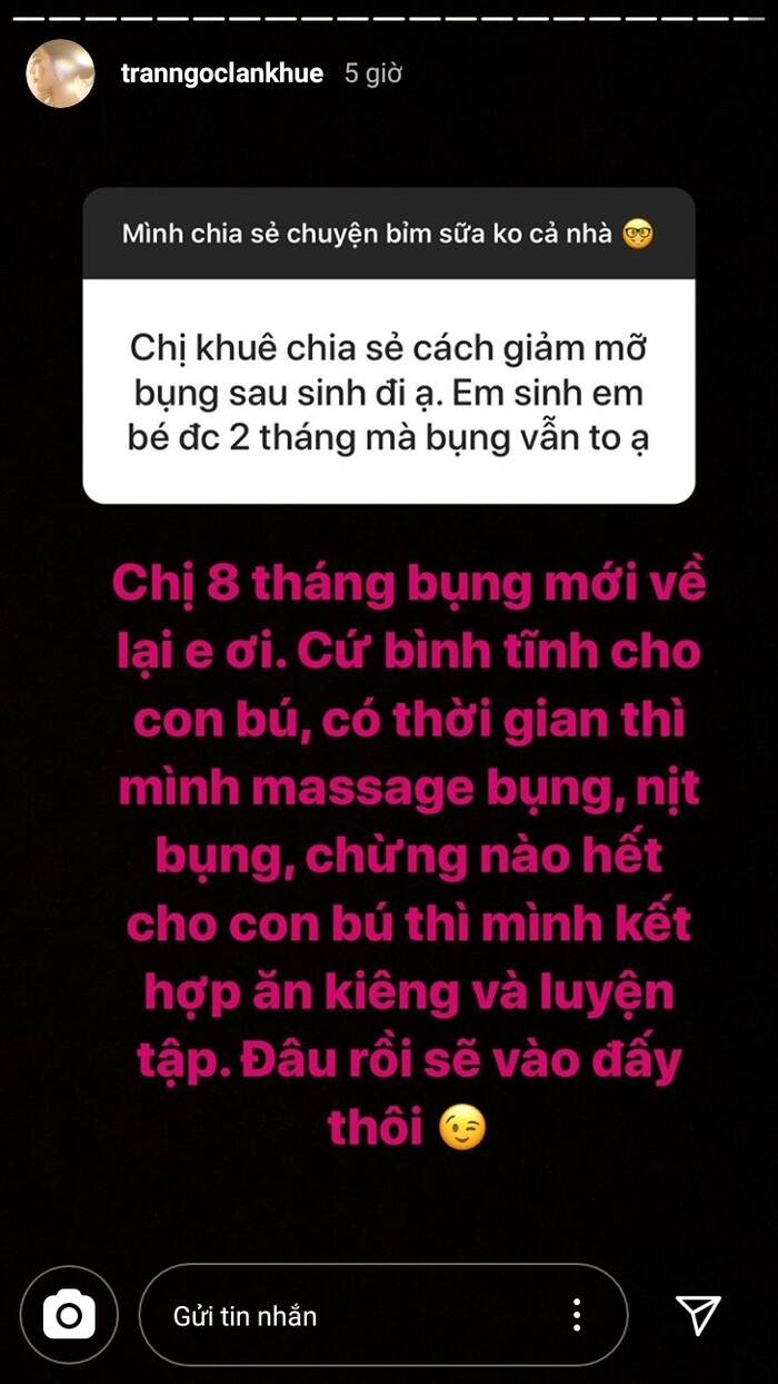 “4 tháng đầu mình cho bé bú nên không có theo chế độ giảm cân. Nhưng có massage bụng, quấn bụng, nịt bụng. Cộng với cho bú và thức đêm cho bú nên cũng xuống, mà xuống ít thôi.