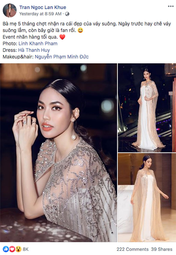 Cũng trong loạt ảnh chia sẻ, Lan Khuê tâm sự thêm rằng: "Ngày trước chê váy suông lắm, còn bây giờ là fan rồi". Nếu để ý có thể thấy thời gian gần đây Lan Khuê mới chăm diện váy suông, còn trước kia, váy ôm mới là items được cô nàng ưu ái.