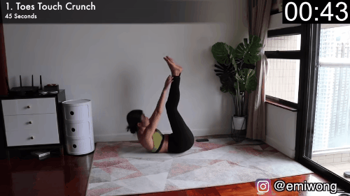 Thực hiện động tác này trong 45 giây. Bằng cách nằm thẳng, đưa chân về góc 90 độ sau đó dùng cơ bụng để nâng người sao cho tay chạm bàn chân. Lưu ý giữ lưng áp sát đất, tránh cong lưng.