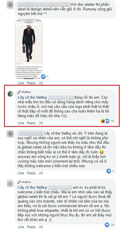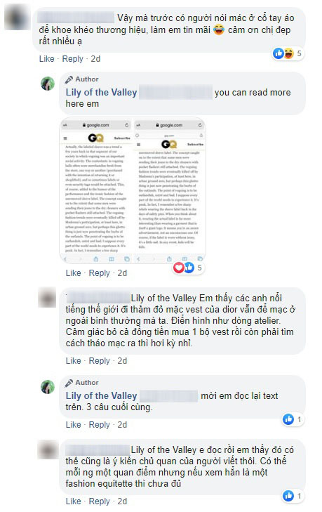 Blogger Lily of the Valley tranh cãi khá gay gắt với dân tình vì quan điểm có nhất thiết phải cắt mác áo hay không. Cô còn khẳng định: "Các nhà mốt lớn đều có dòng dành riêng cho mấy nước châu Á, nơi yêu cầu logo phải thật to, thật đập vô mắt để thông báo cho thiên hạ là tôi đang mặc đồ hiệu".