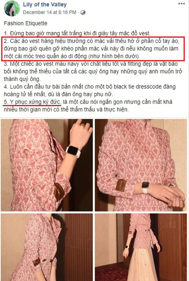 Trong bài viết mới đây, blogger nổi tiếng Lily of the Valley với trang Facebook có gần 60.000 lượt thích và theo dõi đã đăng tải bài viết nói về một vài cách diễn trang phục đúng chuẩn trong thời trang. Đáng chú ý, blogger này nhắc đến việc không cắt phần mác vải thêu ở cổ tay áo khiến người diện trông như "móc treo quần áo di động". Cuối đoạn chia sẻ, blogger này chốt lại bằng một câu khá gay gắt: 'Y phục xứng kỳ đức'.
