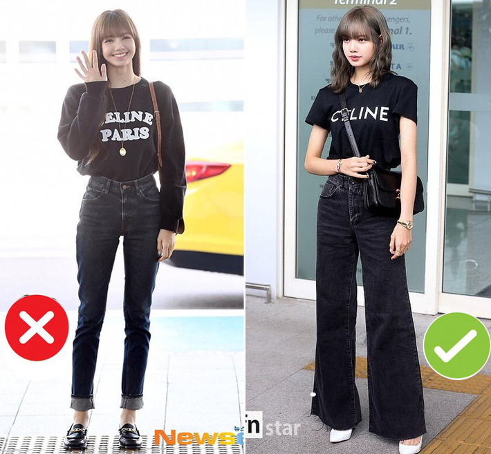 Như vậy là chỉ vì sai lầm khi chọn trang phục mà Lisa đã phơi bày toàn bộ nhược điểm cơ thể mảnh mai, đôi chân tong teo thiếu sức sống chứ không hề sexy, khỏe khắn như trên sân khấu. Lisa cũng chính là minh chứng cho thấy nếu sở hữu vóc dáng gầy gò thì bạn nên tránh xa những mẫu quần jeans tối màu có dáng ôm sát. Thay vào đó bạn có thể chọn những mẫu quần dáng suông rộng, hoặc quần jeans sáng màu sẽ giúp cân bằng vóc dáng tốt hơn.