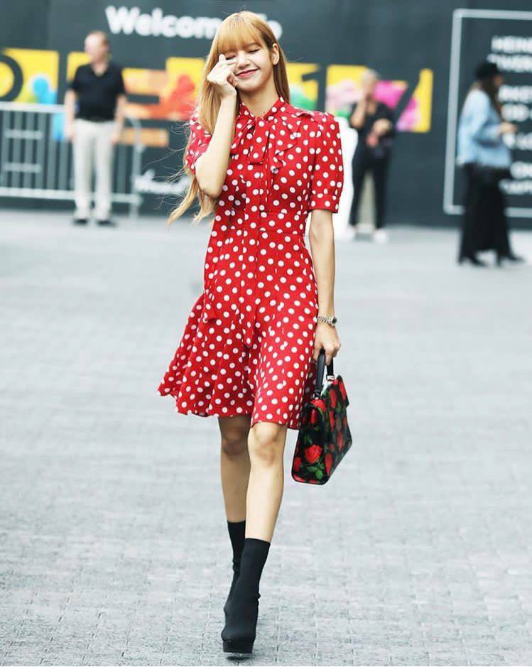 Concept điệu đà hiền lành tiếp tục được Lisa áp dụng khi tới dự sự kiện của Michael Kors không lâu sau đó. Công bằng mà nói, mẫu váy chấm bi lẫn túi in hoa này khá sến và kén người mặc nhưng may là Lisa quá xinh nên người ta cũng không chê trách được gì. Rõ ràng là qua 2 sự kiện của Mulberry và Michael Kors, Lisa vẫn chỉ dừng lại ở mức xinh xắn dễ nhìn như bé hàng xóm nhà bên.