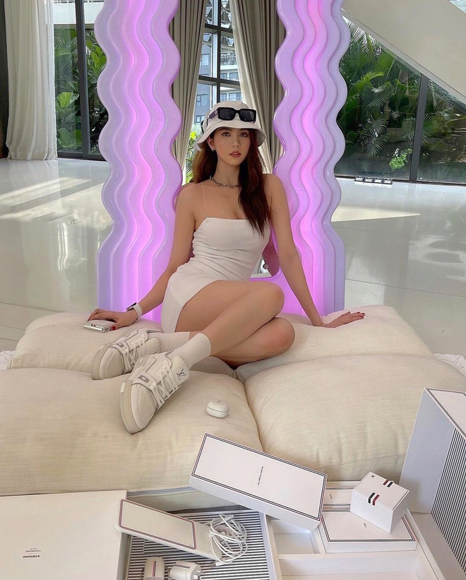Rõ ràng, món phụ kiện được Ngọc Trinh khoe khéo hết cỡ chính là đôi sneaker trắng đến từ Louis Vuitton. Cách tạo dáng đưa 2 chân ra phía trước hay bắt chéo chân sang ngang đều khiến người xem tập trung ánh nhìn vào đôi giày cô đang đeo. Kể cũng phải thôi, diện lên mình đôi Louis Vuitton Trainer Sneaker có giá lên đến 1.220$ (gần 28 triệu VNĐ) thì ai mà chẳng muốn show ra phải không quí vị?