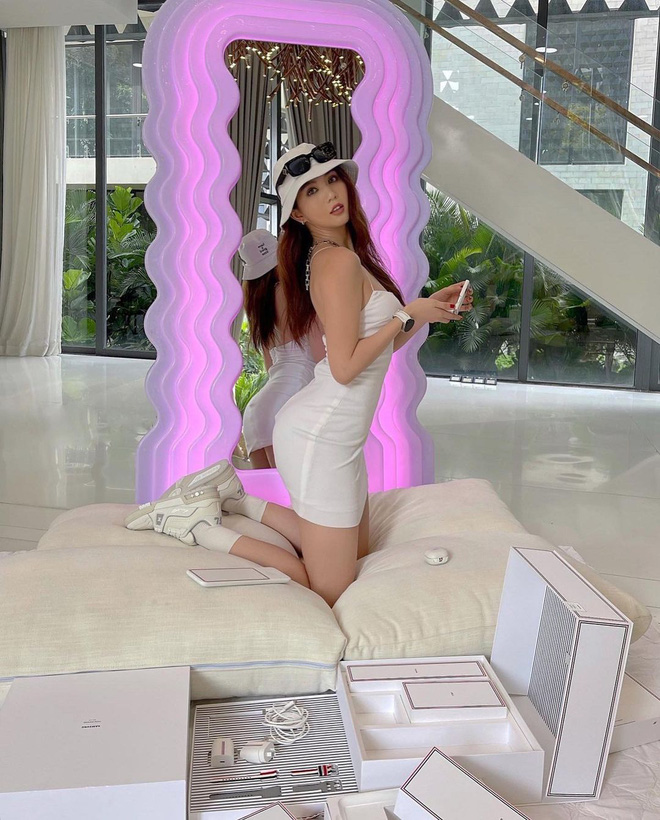 Và không chỉ có loạt phụ kiện hay gương hàng hiệu, loạt ảnh của Ngọc Trinh còn xuất hiện nguyên set Galaxy Z Flip3 Thom Browne gồm tai nghe, điện thoại, đồng hồ thông minh... có giá 57 triệu VNĐ và được bán với số lượng cực giới hạn chỉ 200 set ở Việt Nam. Ở nhà mà Ngọc Trinh ăn chơi quá.