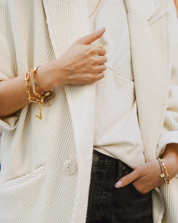 Thế giới phụ kiện luôn rất đa dạng và có nhiều lựa chọn nhưng trong tất cả, những món phụ kiện kim loại màu vàng luôn tạo cảm giác sang chảnh và có chút gì đó quyền lực cho người diện. Bạn có thể diện 1 đôi vòng cổ mảnh, một vài chiếc vòng tay hay đeo nhẫn bằng kim loại màu vàng. Có một gợi ý nhỏ là bạn nên chọn những món phụ kiện có kích cỡ, thiết kế khác biệt thì sẽ khiến bộ đồ trông thú vị hơn khá nhiều.