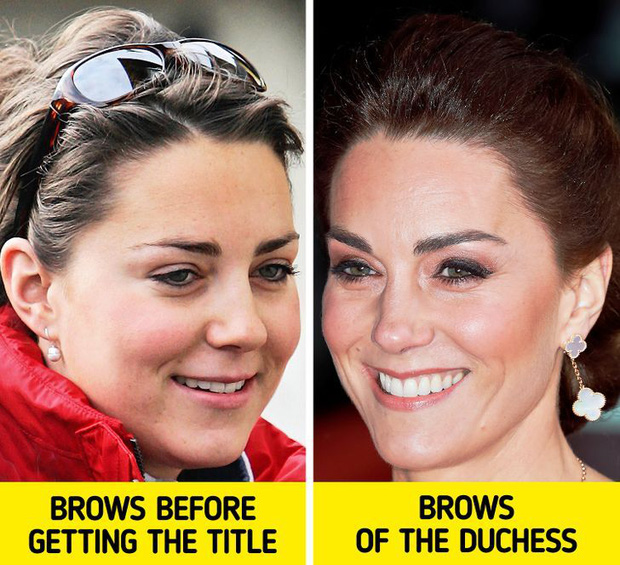 Có thể thấy, dáng mày tự nhiên của công nương Kate khá ngắn và thưa dần về phần đuôi. Phần đầu lông mày thì không vào nếp, khung lông mày cũng không cố định. Điều này khiến diện mạo cô nhạt nhòa, kém sắc nét hẳn đi. Nhưng khi làm dâu hoàng gia thì khác. Không chỉ tạo dáng mày theo đường cánh cung, Kate Middleton còn nâng đường cong chân mày lên cao hơn nhằm tăng thêm khoảng cách giữa mắt với lông mày. Nhờ đó mà diện mạo Công nương nhìn thanh thoát và... quyền lực hơn hẳn.