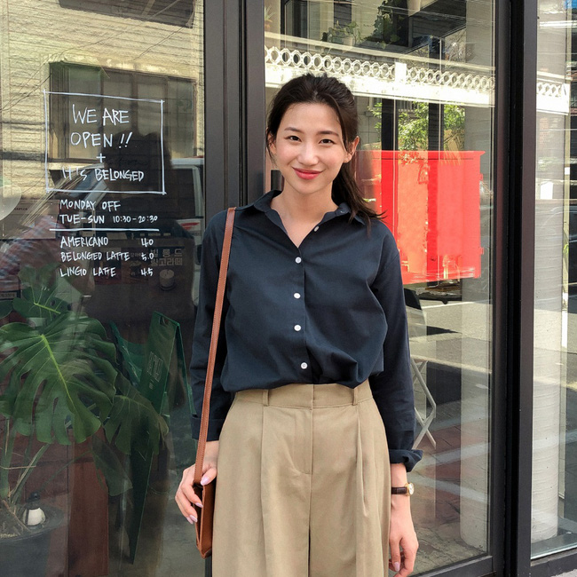 Áo sơ mi màu xanh than trẻ hơn áo sơ mi đen rất nhiều. Bên cạnh đó, vì cũng thuộc bảng màu tối nên kiểu áo sơ mi này giúp tôn da siêu hiệu nghiệm, cho bạn làn da cực kỳ trắng trẻo, tươi sáng. Thêm nữa, kiểu áo này còn “đánh lừa thị giác” người đối diện là bạn gầy mảnh hơn thực tế rất nhiều, do đó những nàng mũm mĩm càng nên lưu tâm kiểu áo này. Diện áo sơ mi màu xanh than thì bạn nên mix với quần/chân váy sáng màu, nhã nhặn như là be hay trắng kem, bộ đồ sẽ có được sự trẻ trung, xịn đẹp hơn rất nhiều.