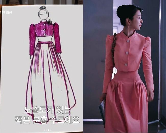 Được biết, đây là 4 thiết kế của NTK Minju Kim - người chiến thắng chương trình Next in Fashion mùa đầu tiên trên Netflix. Trong bài phỏng vấn mới đây của mình, nhà thiết kế đã chia sẻ rằng nhân vật nữ nhà văn Go Moon Young thực sự đã truyền cho bà nhiều cảm hứng sáng tạo. Những bộ trang phục vừa phải thanh lịch, nữ tính nên điểm nhấn chính là sự bồng bềnh. Tuy nhiên cũng cần phải tạo ra sự gợi cảm cho nhân vật và cách mà Minju Kim tạo ra sự sexy này chính là những thiết kế với điểm nhấn ở vòng eo. Riêng bộ đứng lớp dạy học có điểm nhấn đai da, NTK làm phần vai áo phồng và xếp bèo từng tầng để tạo cá tính mạnh mẽ cho nhân vật.