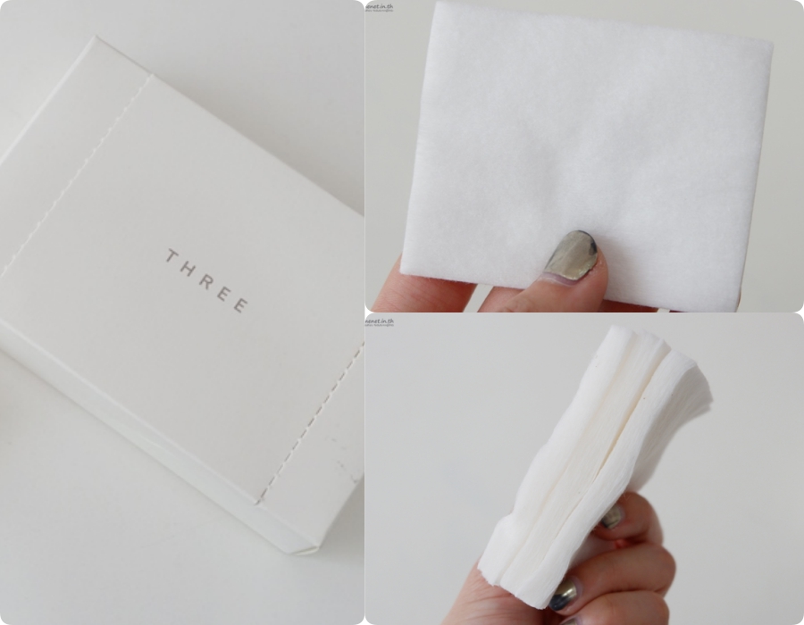 Đắt nhất trong danh sách này chính là bông tẩy trang organic của Three. Hộp có 14 miếng, to bằng miếng bông của Muji, nhưng chất bông mềm mịn hơn và dày hơn chút. Khi sử dụng không bị xơ và bết dính như của Muji. Một miếng có thể tách ra nhiều miếng mỏng để vừa tẩy trang vừa đắp toner lên da.