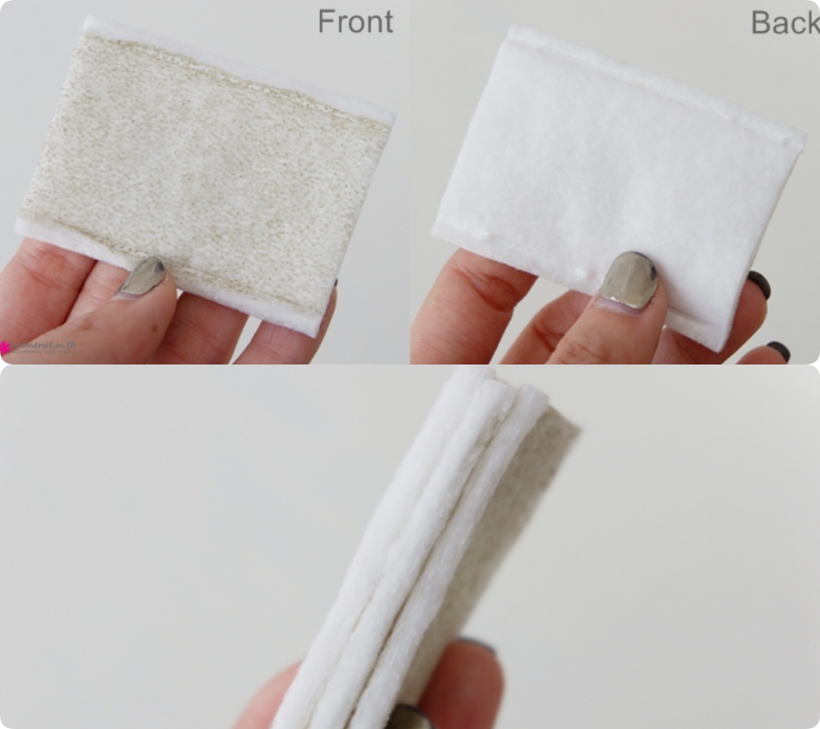 - Bản thân phần rìa của miếng bông sử dụng kỹ thuật gấp mép nên khi dùng lotion để lau hay tẩy trang, sợi bông sẽ không đọng lại trên mặt.