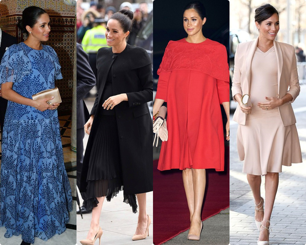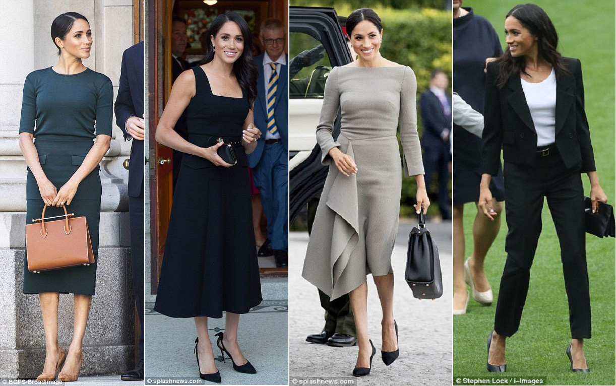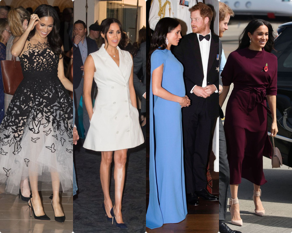 Tủ đồ của Công nương Meghan trong chuyến đi này điểm danh rất nhiều thương hiệu cao cấp như Christian Dior, Givenchy, Oscar de la Renta, Burberry, Stella McCartney... xen kẽ với hơn chục thương hiệu bình dân.