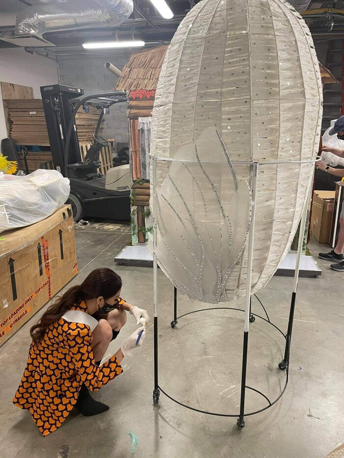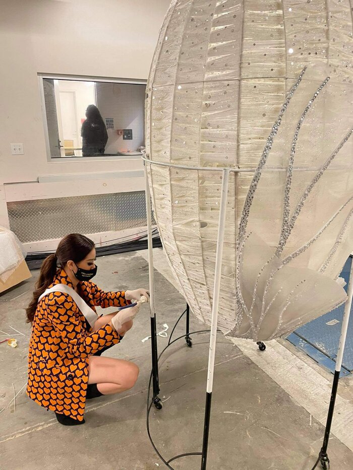 Trước khi đem Kén Em tỏa sáng trên sân khấu, ít ai biết trong quá trình vận chuyển sang Mỹ và lắp ráp hoàn thiện, "Kén Em" đã gặp trục trặc và tranh thủ thời gian sau phần thi phỏng vấn, Khánh Vân đã chỉnh sửa, sơn phết lại Kén Em.