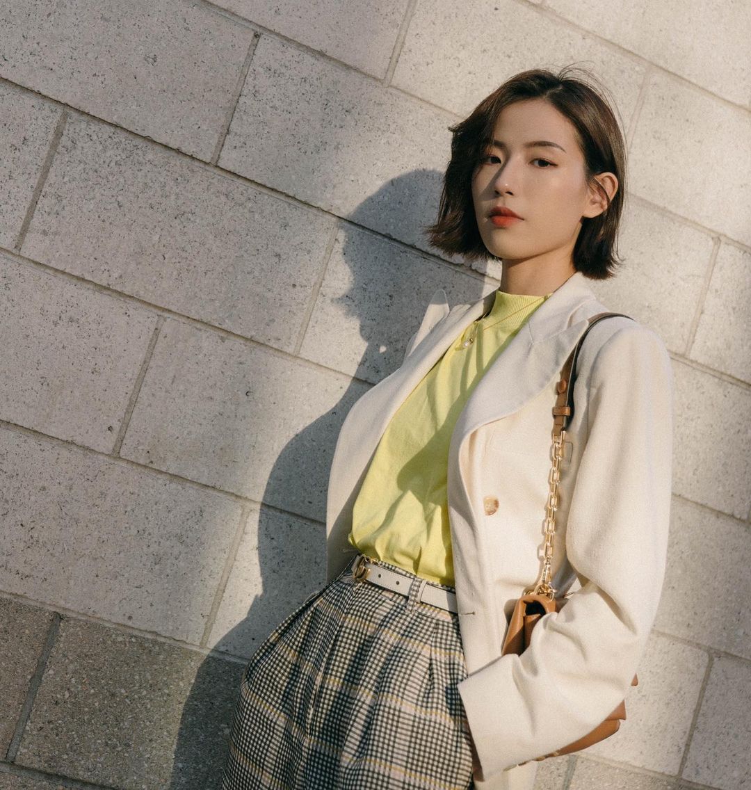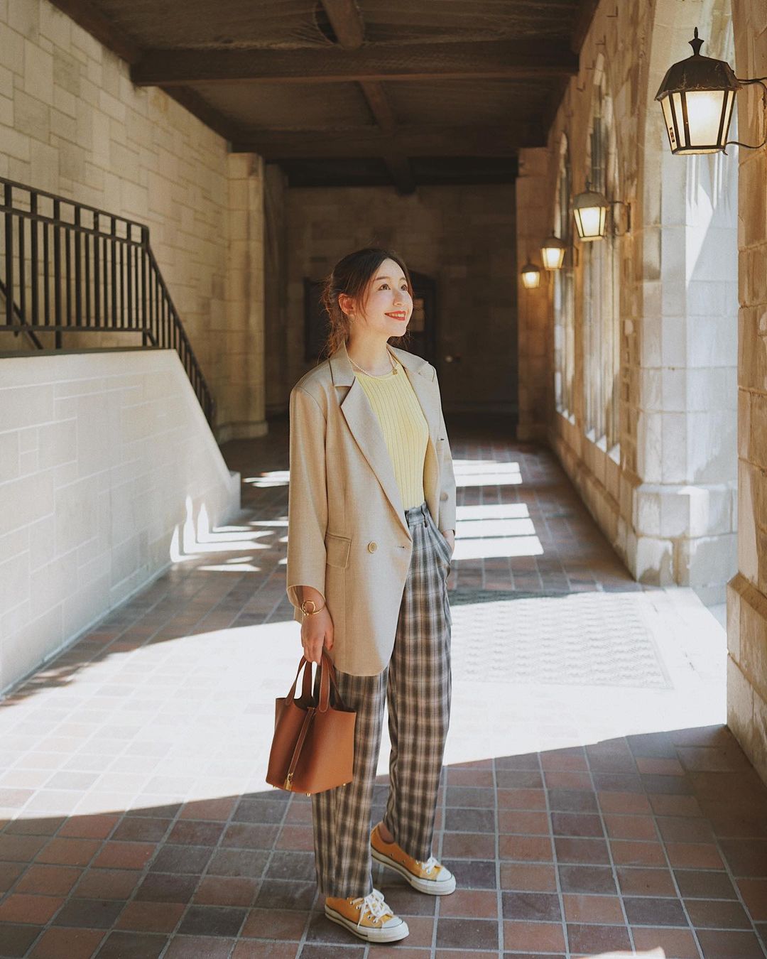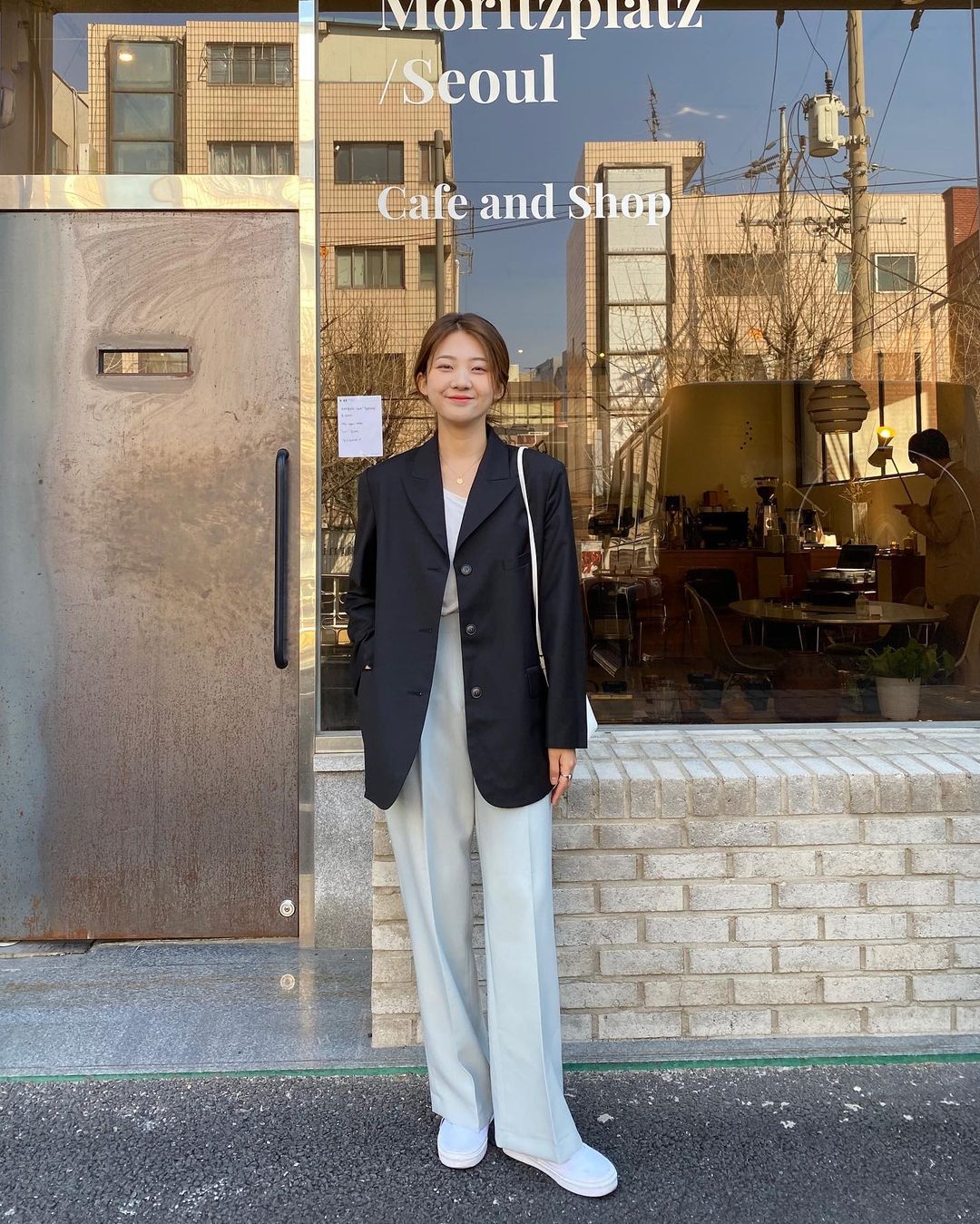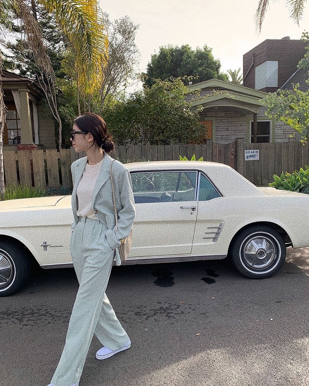 Như đã nói ở trên, đừng chỉ diện những chiếc quần âu đen mà bạn đã mặc mãi khi đi làm. Quần âu còn có phiên bản mang những màu pastel tươi sáng, ngọt ngào mà vẫn hợp cạ với blazer, tạo nên những set trang phục trẻ trung nhưng vẫn ghi điểm thanh lịch. Với combo blazer và quần âu pastel, bạn nên đi giày sneaker trắng hoặc những đôi giày màu nhã nhặn khác để gia tăng vẻ tinh tế cho cả tổng thể.