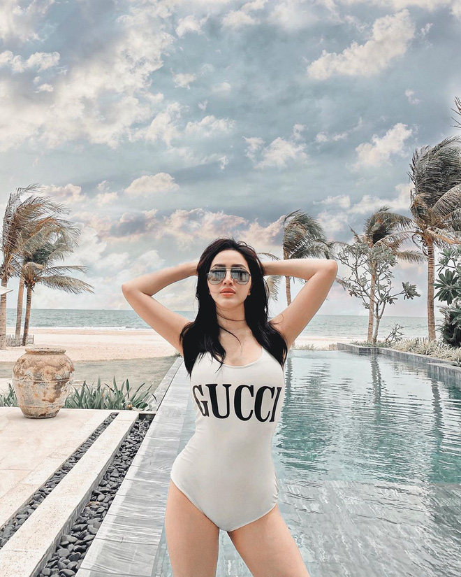 Hậu cách ly, Bảo Thy là người năng diện đồ bơi nhất trong số các sao Việt. Chắc vì cũng muốn chụp nhiều hình để sống ảo nên cô mang nhiều bộ đi lắm, bikini hay một mảnh đều đủ cả. Điểm chung của chúng là đều có phom dáng khá tối giản và không hề có chút bèo nhún rối mắt.