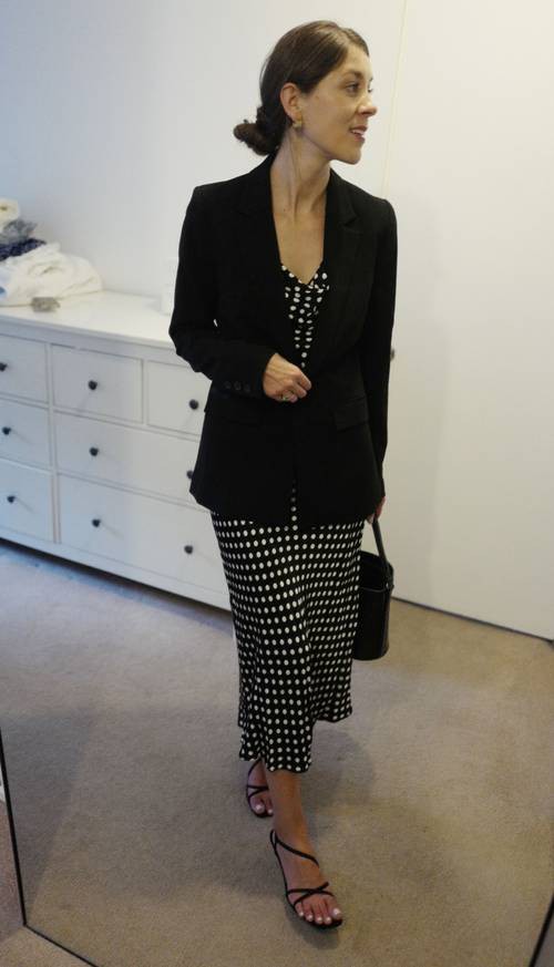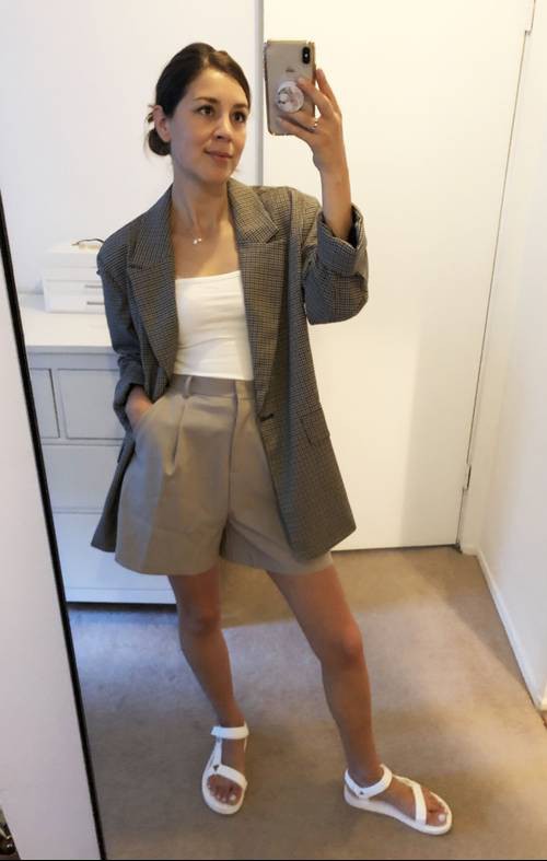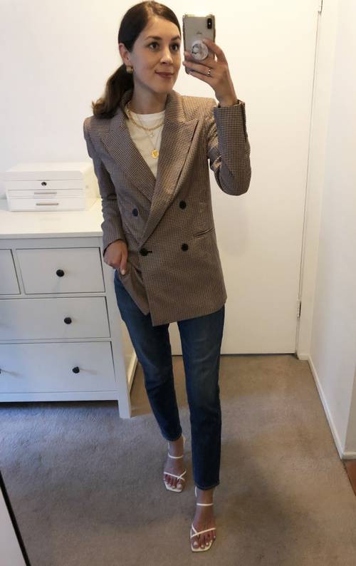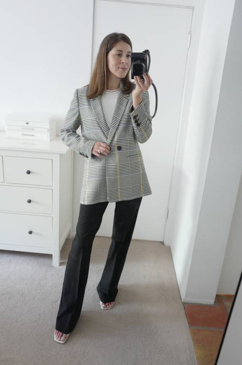 BTV Joiede Jude gợi ý set đồ dành riêng cho nàng công sở khi diện thiết kế blazer kẻ này. "Thiết kế balzer khuy đơn đa phần có dáng hơi rộng nên nếu bạn muốn hack chiều cao cho mình hãy kết hợp cùng quần âu dài chấm gót kèm đôi cao gót sang chảnh. Vóc dáng sẽ mảnh mai cao ráo hơn hẳn chưa kể phong cách công sở cũng được nâng tầm khá nhiều" - Cô chia sẻ.