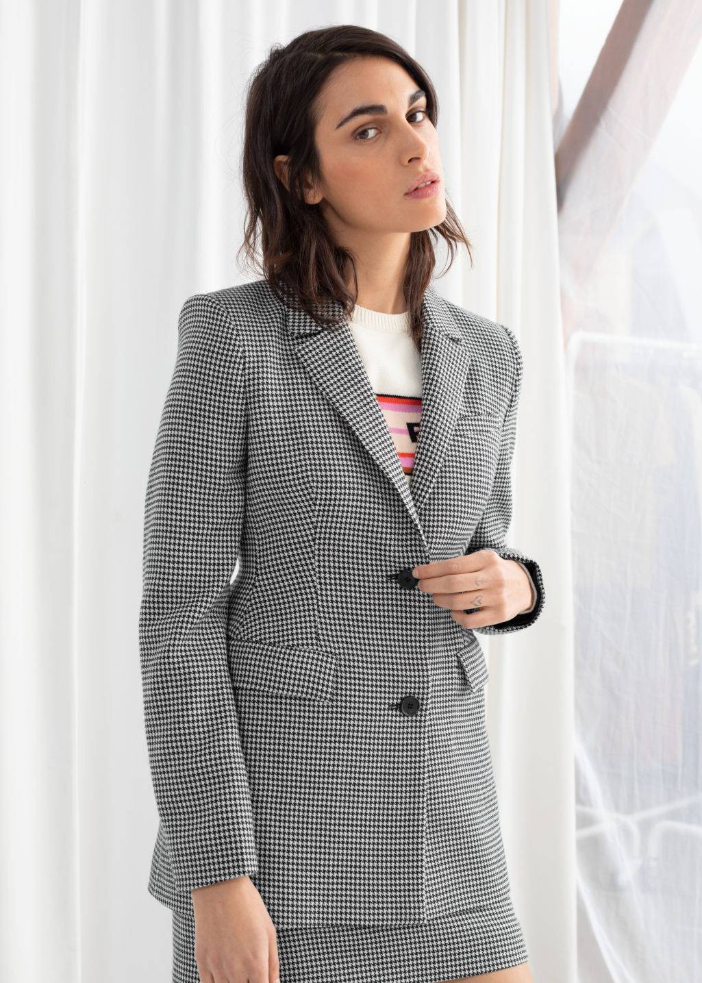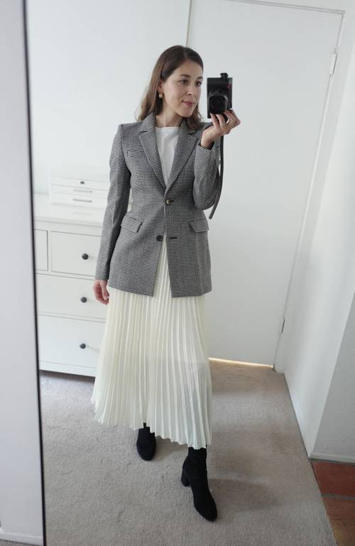 Chính vì có hàng khuy đôi nên thiết kế sẽ hơi thắt eo một chút, họa tiết kẻ houndstooth rất hợp với những cô nàng nữ tính thích style cổ điển nhẹ nhàng. Với thiết kế này BTV Joiede Jude gợi ý một set đồ nữ tính mềm mại dành cho nàng công sở. Đó là kết hợp blazer cùng chân váy voan xếp ly nhẹ nhàng đơn giản.