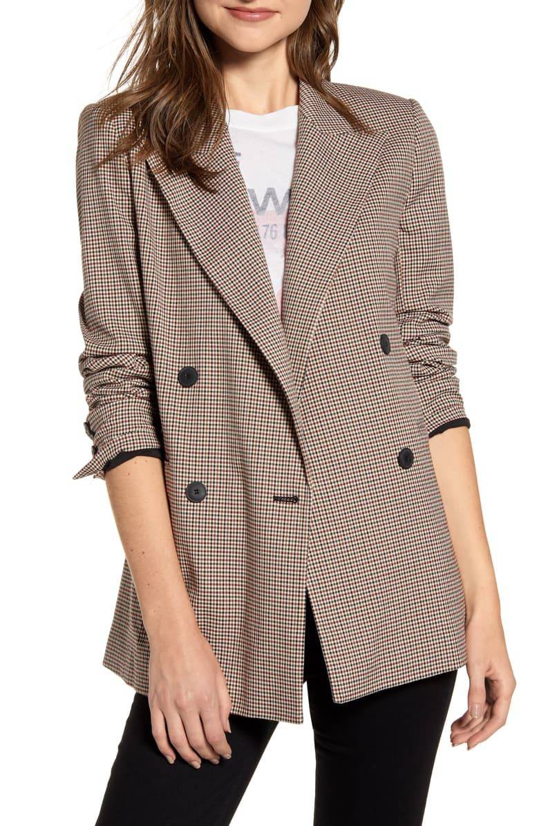 Áo blazer hai hàng khuy cũng là một dáng áo cơ bản. Thiết kế với điểm nhấn hai hàng khuy có thể là đơn hoặc kép tạo đường nét có phần góc cạnh và cứng cáp hơn những thiết kế cổ điển đơn thuần mang lại một cái nhìn độc, lạ và chất hơn cho trang phục công sở hàng ngày. Thiết kế cực kỳ hợp để bạn mix cùng skinny/ jeans ống đứng và áo phông; dù bạn cài khuy nghiêm chỉnh gọn gàng hay buông hờ hững thì cũng đẹp một cách chuẩn chỉnh.