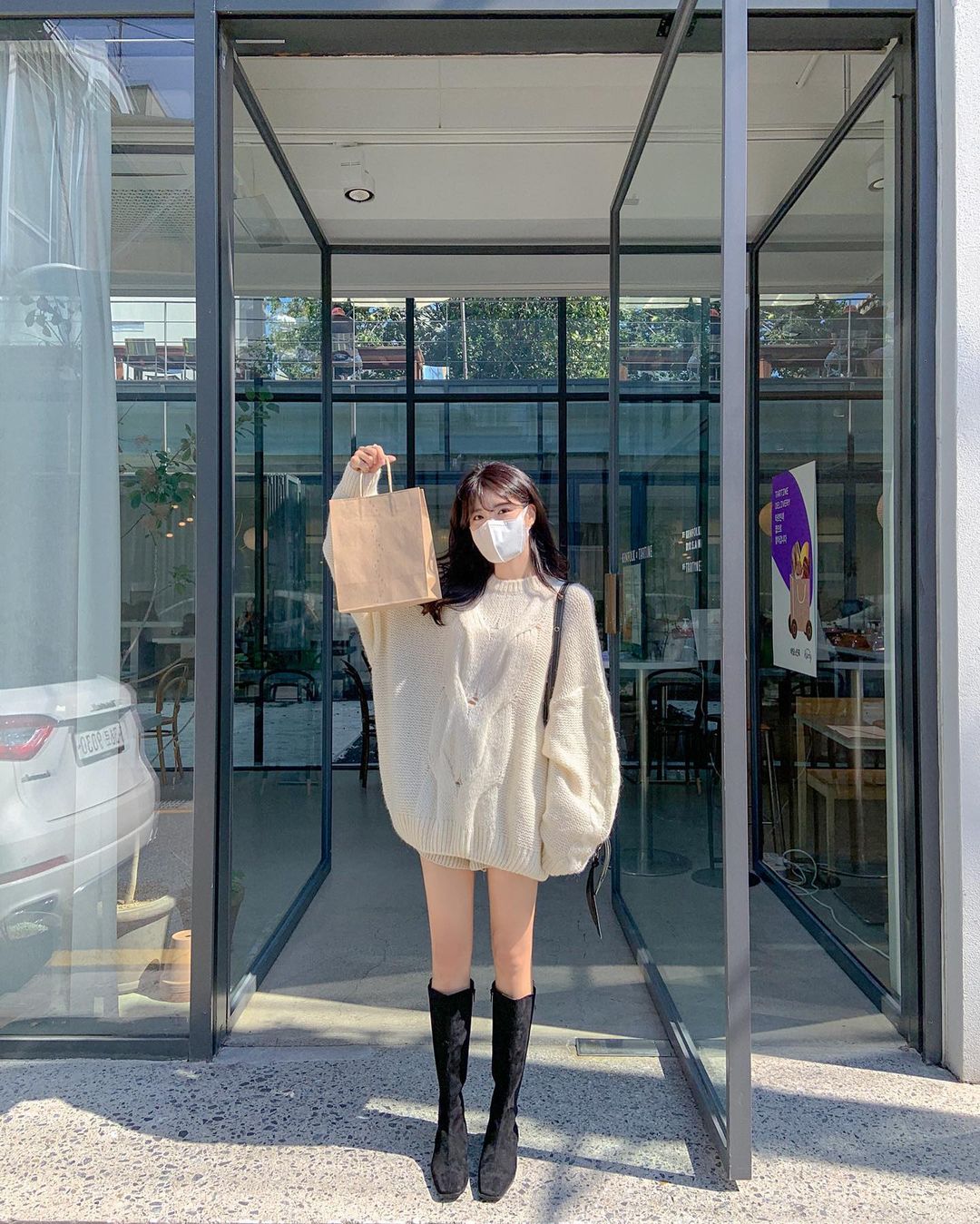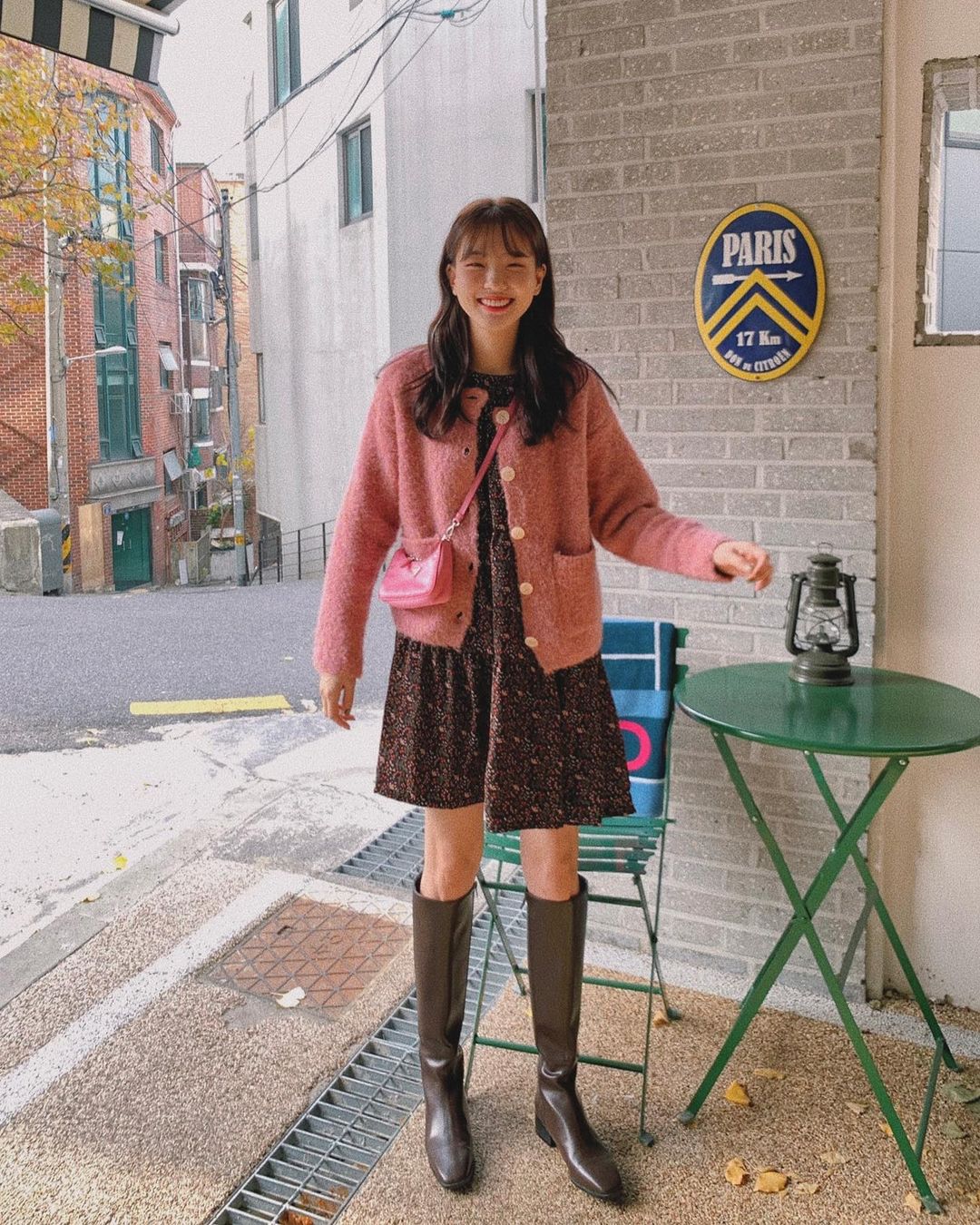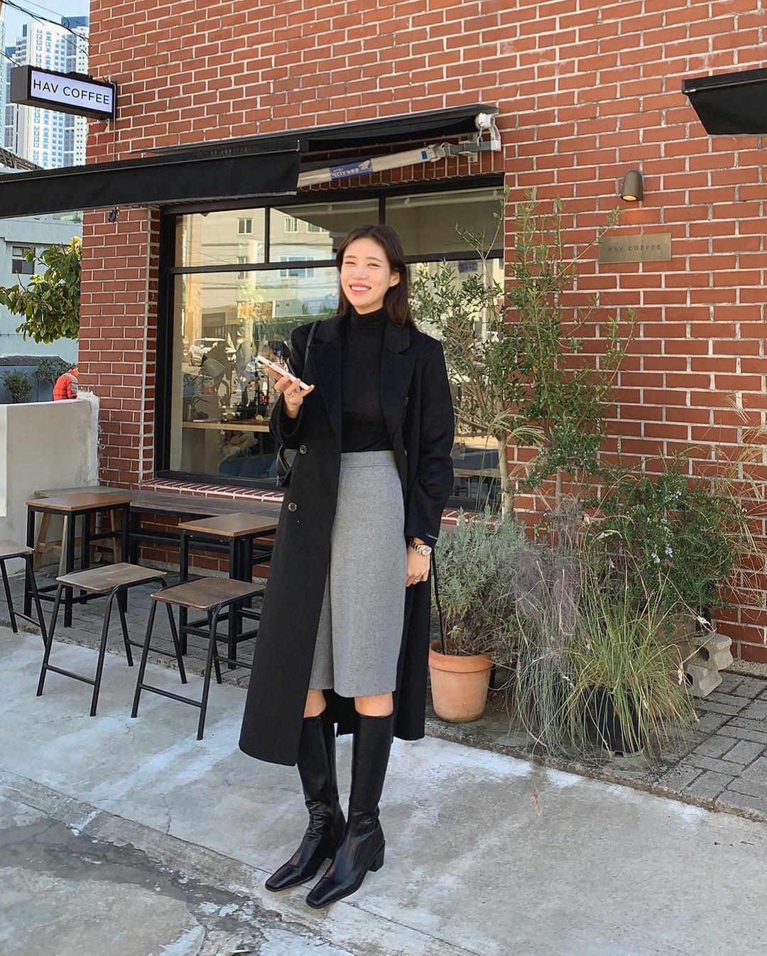 Bộ đôi váy liền/chân váy ngắn + boots cao cổ còn hack dáng hiệu quả đến mức bạn chẳng cần phải nhờ cậy đến thao tác sơ vin, vóc dáng vẫn cao ráo hơn thực tế rất nhiều.