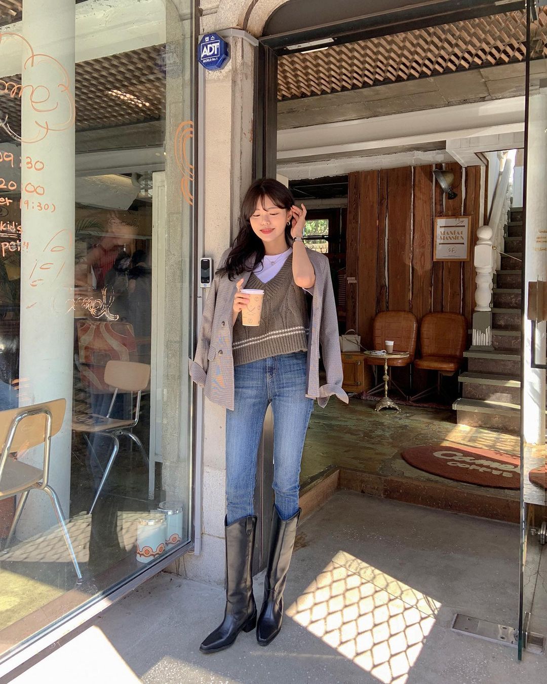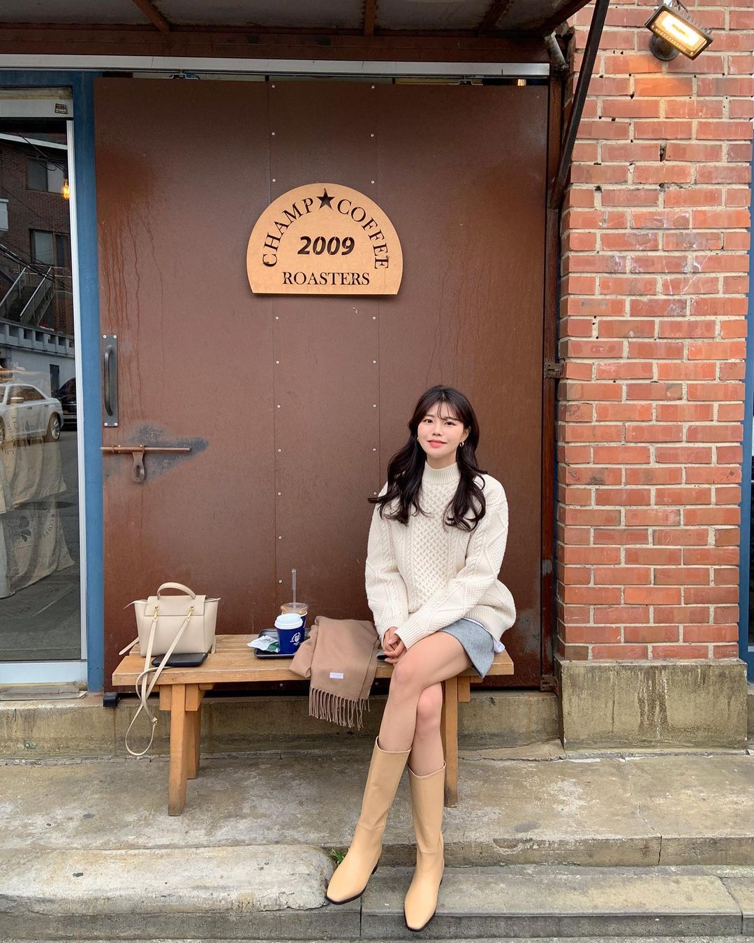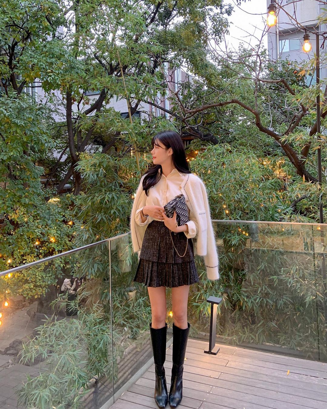 Bộ đôi váy liền/chân váy ngắn + boots cao cổ còn hack dáng hiệu quả đến mức bạn chẳng cần phải nhờ cậy đến thao tác sơ vin, vóc dáng vẫn cao ráo hơn thực tế rất nhiều.