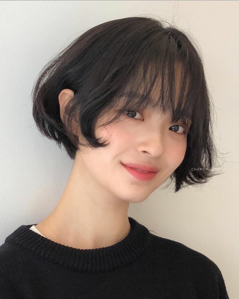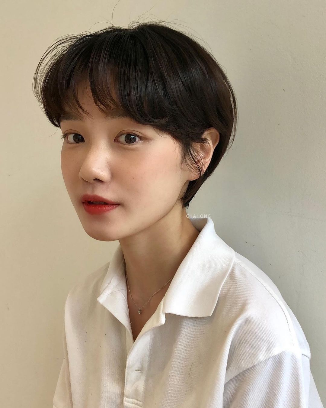 Các bạn cứ để ý mà xem, một khuôn mặt tròn tròn đáng yêu bao giờ nhìn cũng trẻ hơn một khuôn mặt dài, và kiểu tóc ngắn sẽ sẽ giúp khuôn mặt như tròn lại. Phần chân tóc được cắt bằng, không sử dụng kỹ thuật cắt layer và có độ dài ngang cằm sẽ giúp phần cằm như nhỏ lại, từ đó giúp khuôn mặt nhìn trẻ hơn.