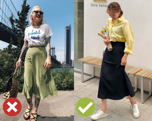 Chính độ bóng bẩy, mỏng manh của chân váy lụa sẽ "tố" vòng eo không được thon gọn lắm của người mặc, đặc biệt là khi bạn sơ vin. Chính vì lý do này, nàng bụng lớn phải rất cẩn trọng khi diện chân váy lụa và cách tốt nhất chính là bỏ qua công đoạn cắm thùng, rồi mix cùng chiếc áo dáng oversized.
