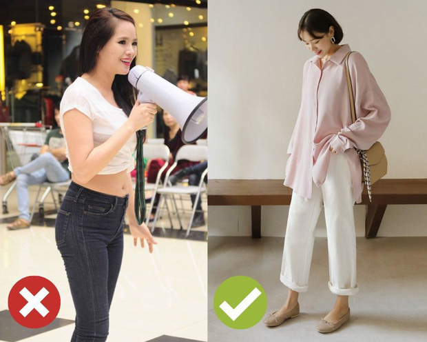 Mục đích chính của áo crop top chính là khoe triệt để vòng eo thon gọn, đồng thời tăng vẻ sexy cho người mặc. Vậy suy ra, áo crop top không phải là item lý tưởng dành cho nàng bụng mỡ, nhất là khi mix với quần cạp trễ hay mid-rise jeans (quần cạp thường).