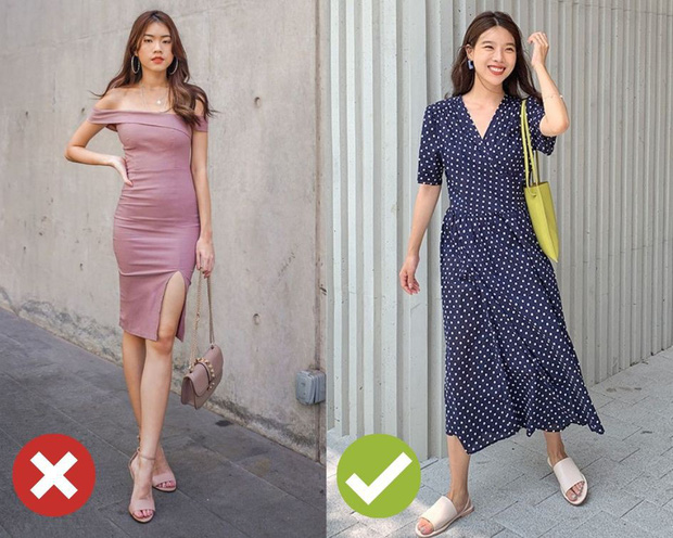 Trừ phi bạn sở hữu vòng bụng phẳng lì, chẳng có lấy 1 centimet mỡ thừa; bằng không, đừng diện váy ôm sát bởi đây chính là "kẻ mách lẻo" nguy hiểm nhất, khiến vòng bụng lớn của bạn càng thêm nổi bật. Sự thay thế lý tưởng, không gì khác là váy nhấn eo, váy quấn hoặc váy suông, diện lên vừa đảm bảo nét nữ tính, yêu kiều và quan trọng, không "tố giác" vòng eo bánh mỳ của bạn.