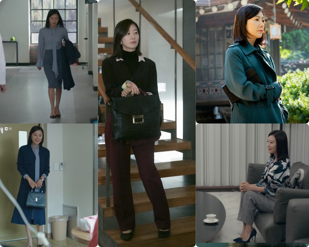 Trong khi style của Lee Ji Ah lại thiên về nét nữ tính cộp mác tiểu thư đài các với những cách khoác blazer sang chảnh hay những set đồ với gam màu trung tính cơ bản. Có thể thấy ngay cả khi các vị phu nhân giàu có khác hay ngay cả cô tiểu tam ác nữ suốt ngày diện váy áo lộng lẫy, thể hiện đẳng cấp thì riêng Shim Su Ryeon lúc nào cũng từ tốn nhẹ nhàng với những bộ đầm màu nude, trắng tinh khôi hay những bộ suits đứng dáng nhưng cách điệu khéo thể hiện cá tính mạnh mẽ ẩn sâu.