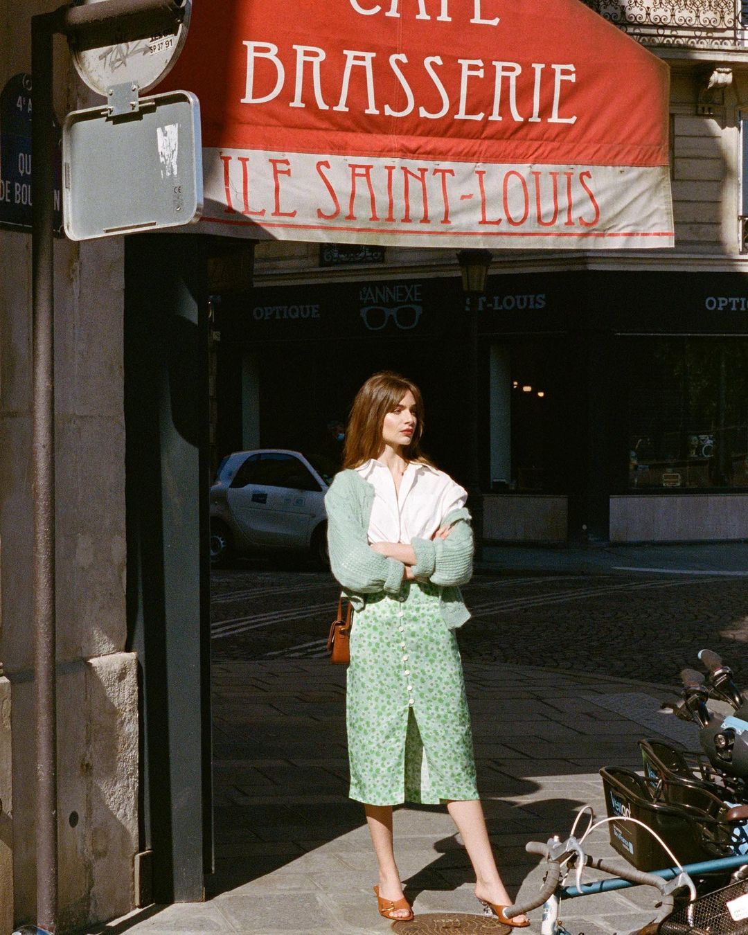 Nếu nghĩ rằng, những quý cô thanh lịch và tinh tế như phụ nữ Pháp sẽ chỉ diện chân váy trơn màu thôi thì chị em đã nhầm. Chân váy trơn màu tất nhiên vẫn chiếm một vị trí trong tủ đồ của gái Pháp vì dễ mặc, dễ đẹp, nhưng bên cạnh đó, họ còn rất ưu ái chân váy họa tiết nữa. Mara Lafontan diện mẫu chân váy này với tần suất khá dày, và biến tấu linh hoạt với nhiều phiên bản như chân váy hoa ngắn, chân váy xẻ tà...