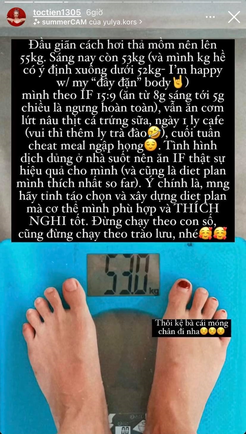 Ngoài ra, bên cạnh việc chia ca ăn uống, Tóc Tiên còn chịu khó tập thể dục như đạp xe, tập yoga để body dẻo dai, thon thả hơn. Nếu cũng đang tìm kiếm kế hoạch giảm cân hiệu quả trong mùa dịch này thì bạn có thể áp dụng ngay phương pháp của Tóc Tiên.