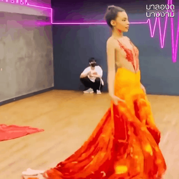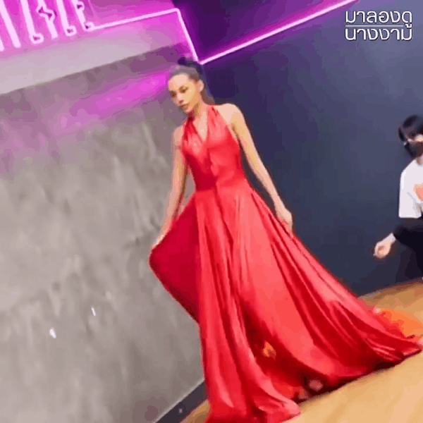 Mới chỉ dừng ở đoạn clip tập luyện trước thềm Miss Grand mà Indy Johnson đã tung chiêu ác liệt đến vậy. Cô diện một bộ đầm dạ hội cổ yếm màu đỏ rực rỡ thực hiện những bước catwalk uyển chuyển, nhưng đi được vài bước đã vội tung váy "thoát xác".