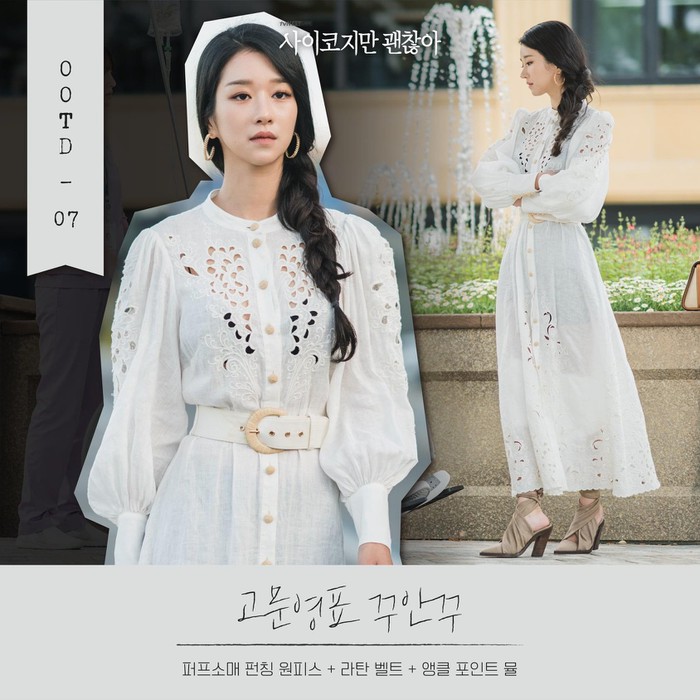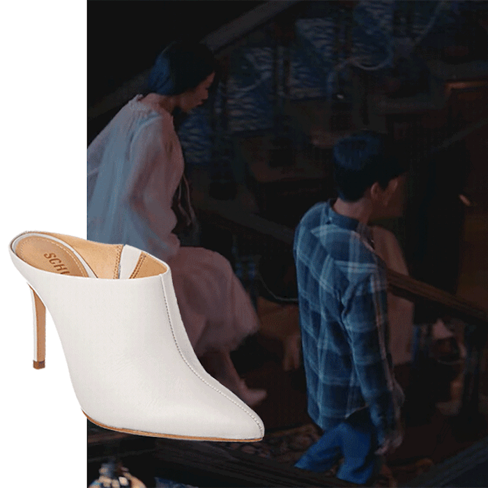 Ngay cả khi diện váy ngủ ở nhà, Seo Ye Ji cũng đi cao gót. Đôi mules trắng hiệu Schutz xuất hiện trong rất nhiều cảnh quay khi nữ nhà văn ở trong lâu đài "bị nguyền rủa". Một trong những phân cảnh thu hút nhất chính là khi Seo Ye Ji vô tình trượt chân ở cầu thang và ngay lập tức Kim Soo Hyun dang tay ra đỡ.