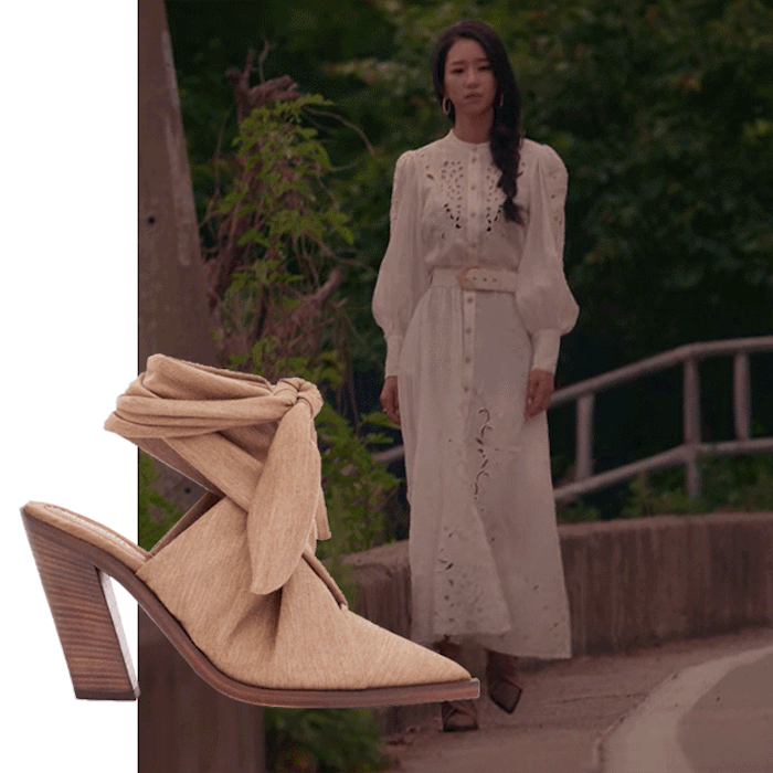 Tất cả những đôi giày cao gót mà Seo Ye Ji đi trong phim đều là những thiết kế độc đáo được dày công lựa chọn để hợp với từng bộ váy của cô. Đôi sandal buộc dây hiệu Burberry này là một ví dụ. Diện cùng bộ váy trắng đục lỗ theo phong cách Boho nữ tính, đến mái tóc cũng được tết lệch một bên, Seo Ye Ji xỏ chân trong một thiết kế sandals vải màu be buộc dây ngang cổ chân, một sự mix&match không gì hoàn hảo hơn.